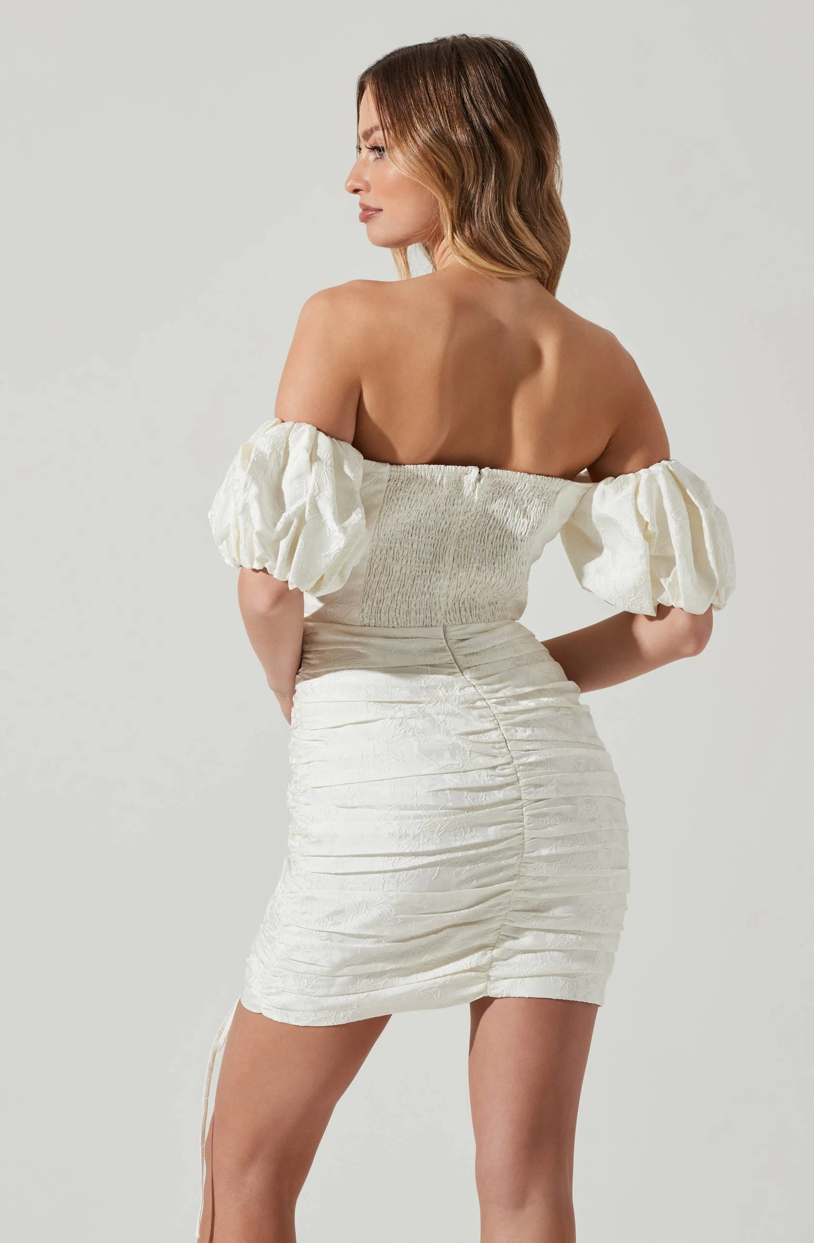 For romantic evenings, this mini dress takes your look to swoon-worthy levels. Sweetheart neckline leads to a cupped bust and ruched bodice with a drawstring accent at the hem. Short puff sleeves. Smocked back and concealed back zip closure. Fully lined.