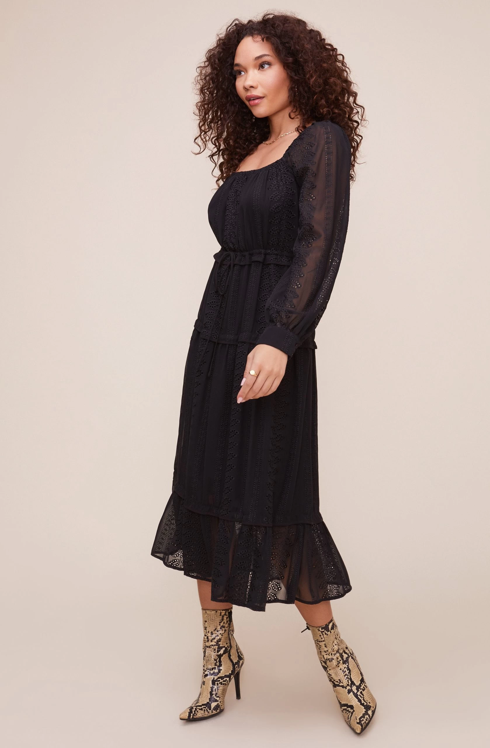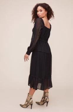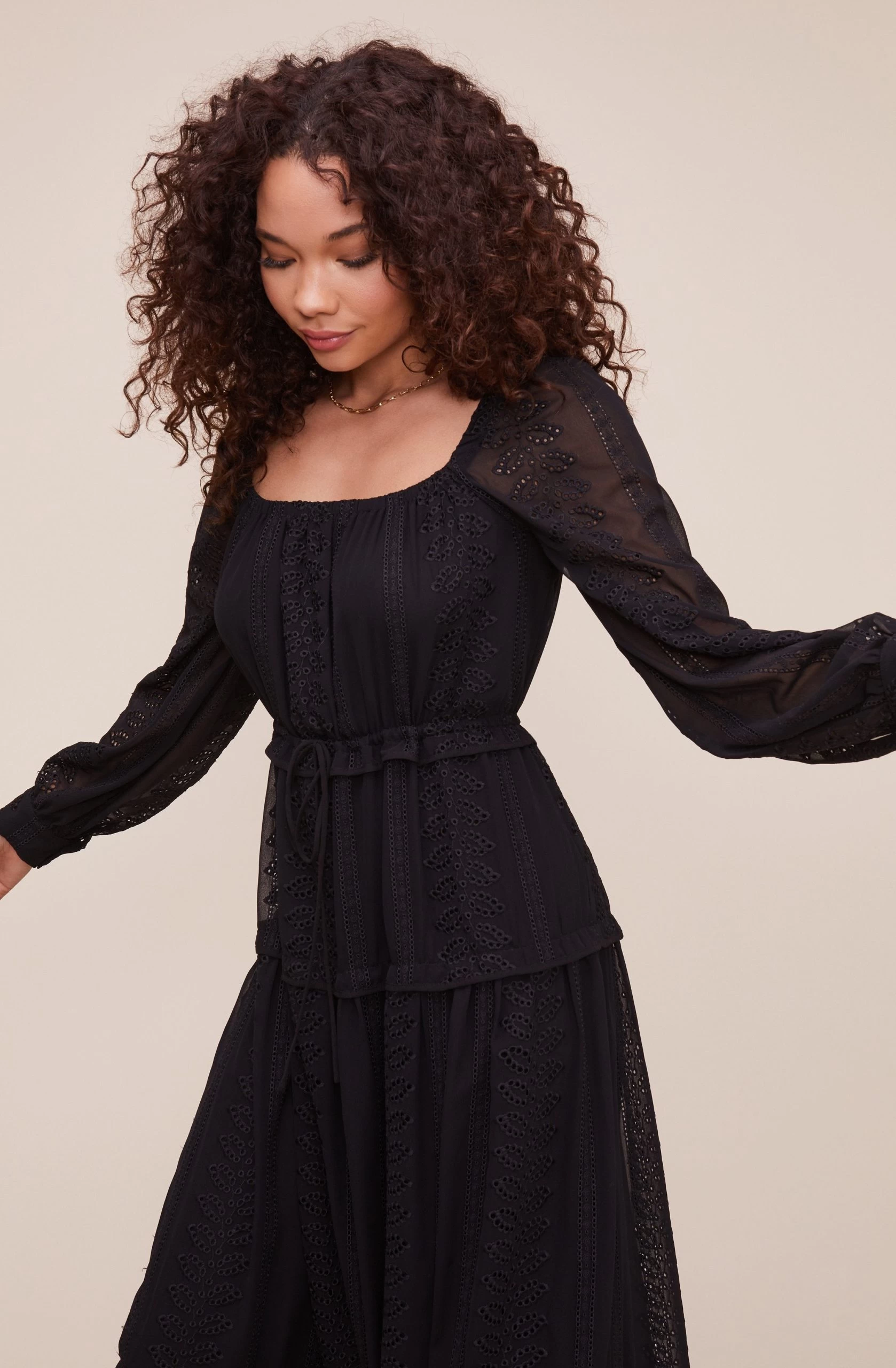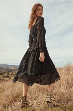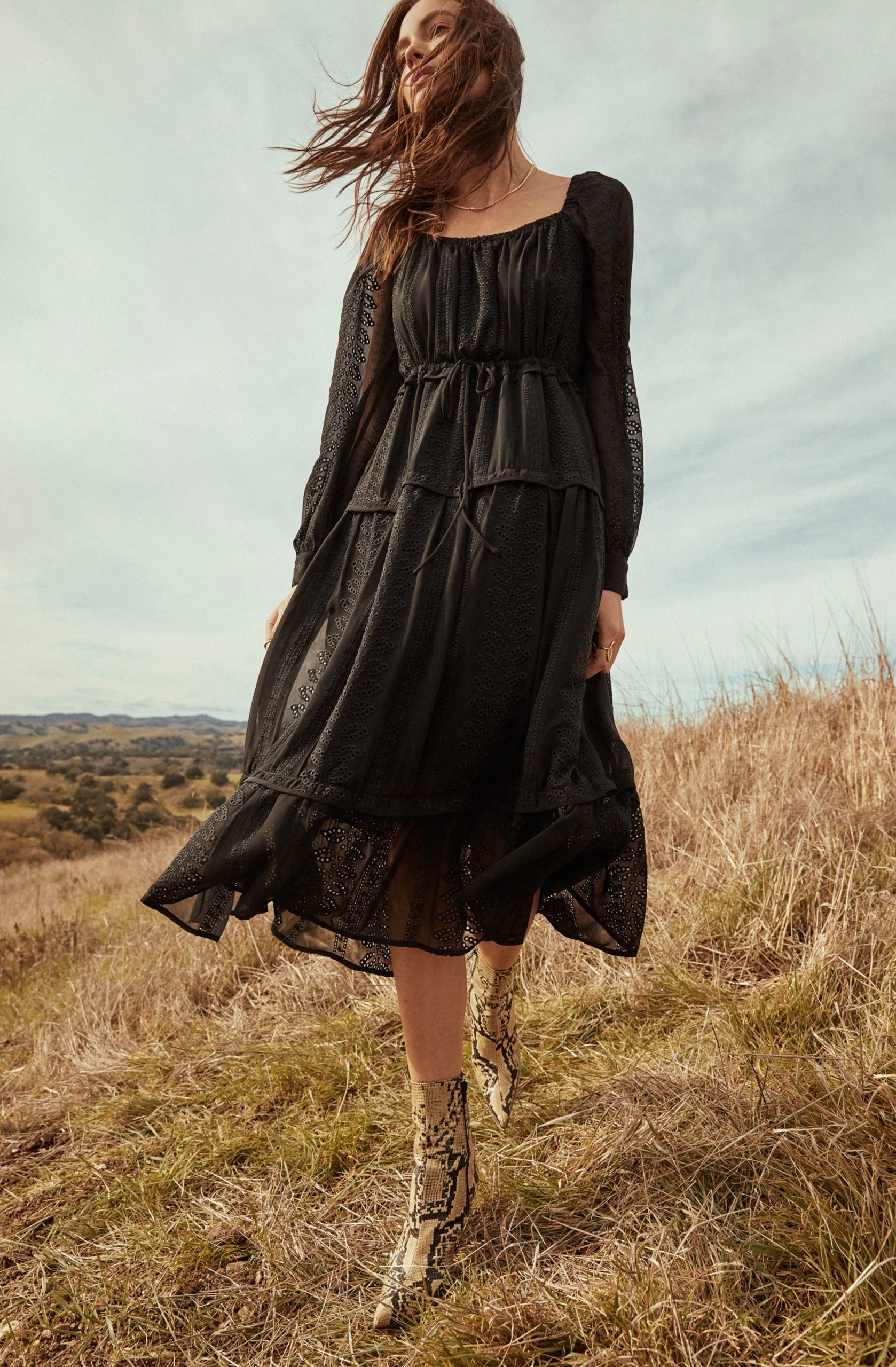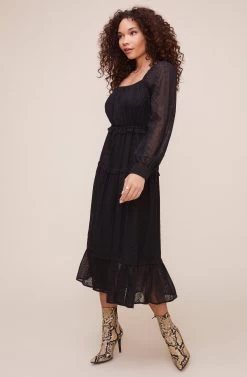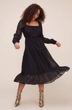 Style is in your favor. The Padma dress features a square neckline that leads to a cinched waist and tiered midi skirt. Long sheer sleeves.