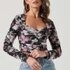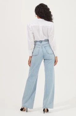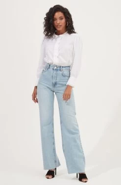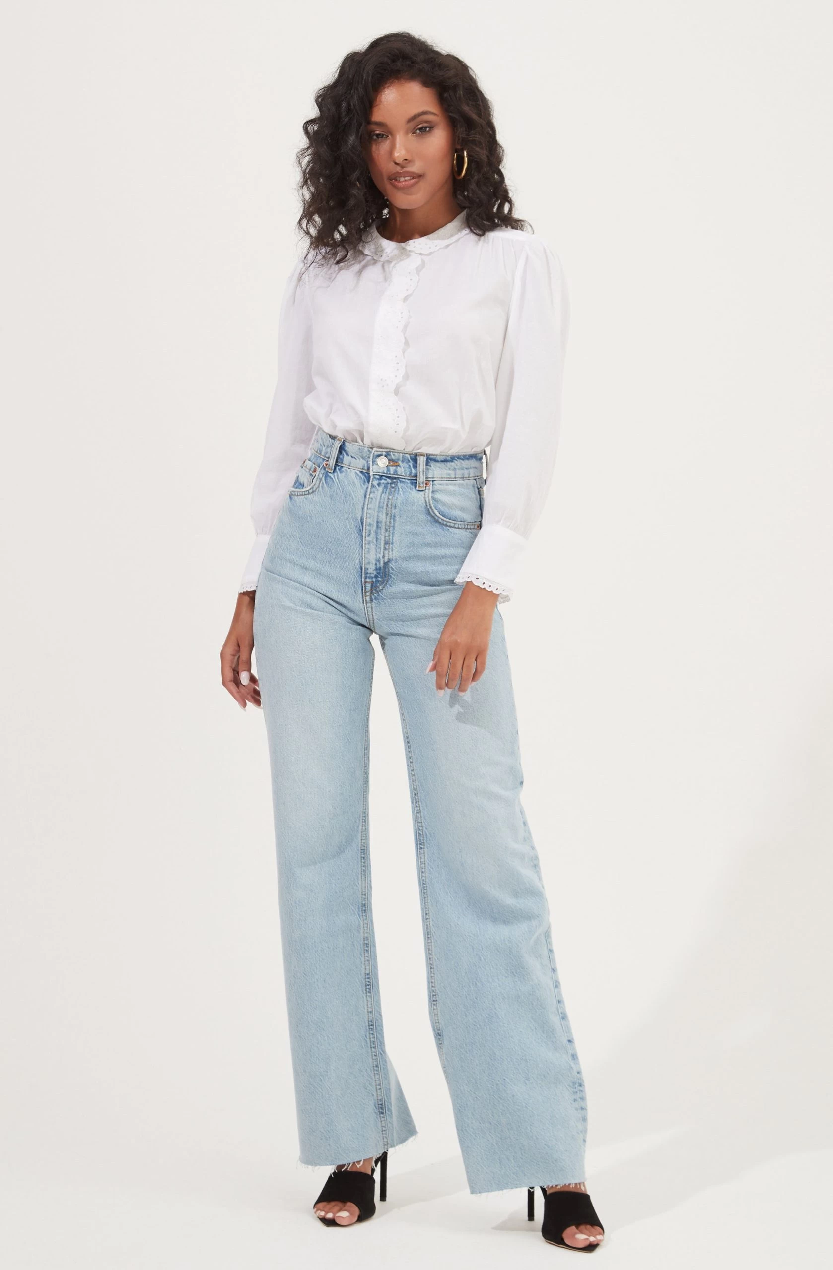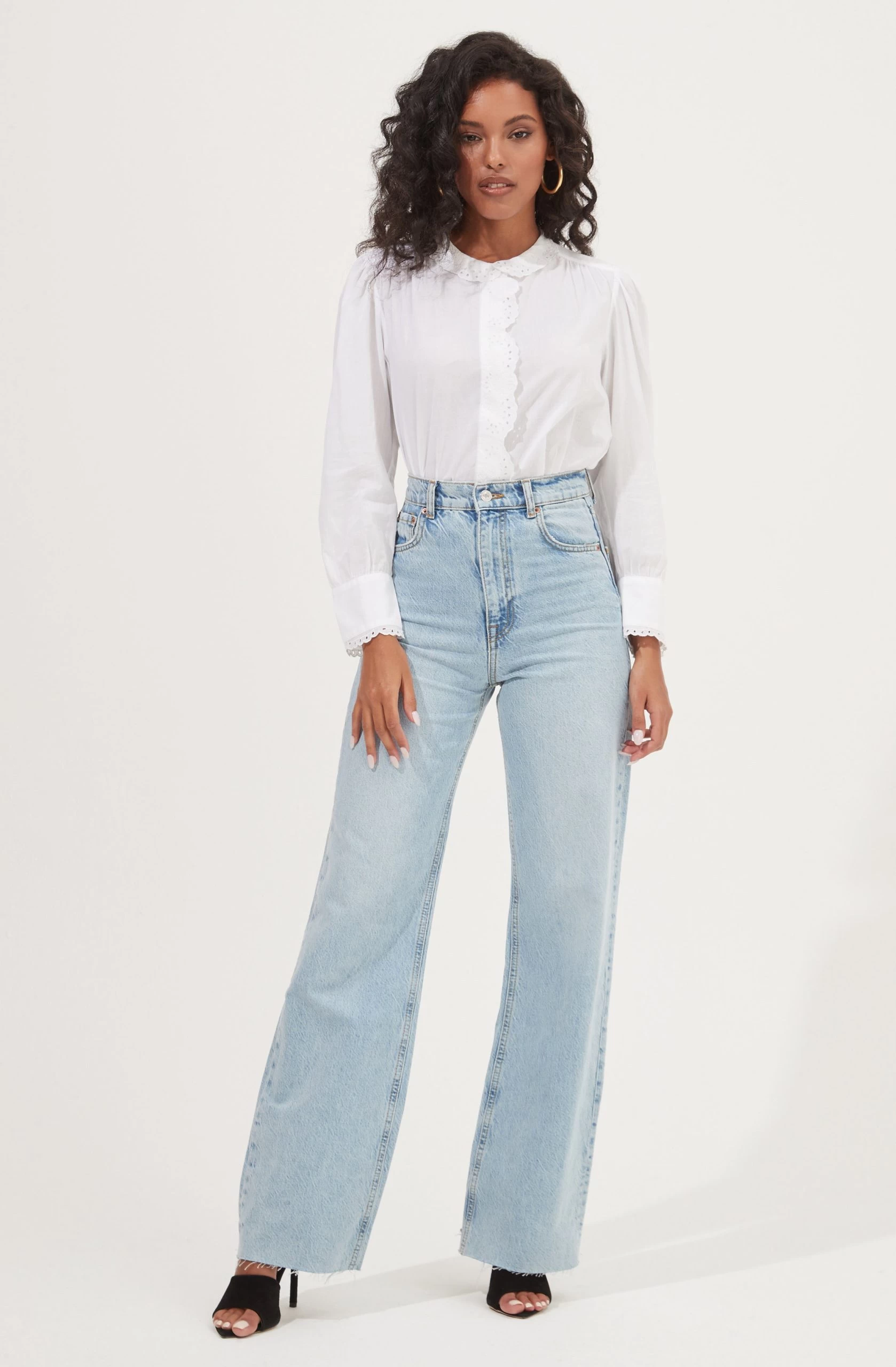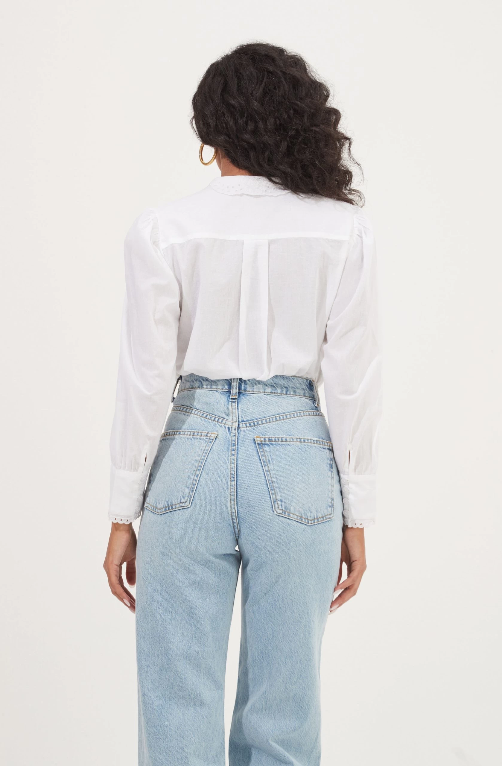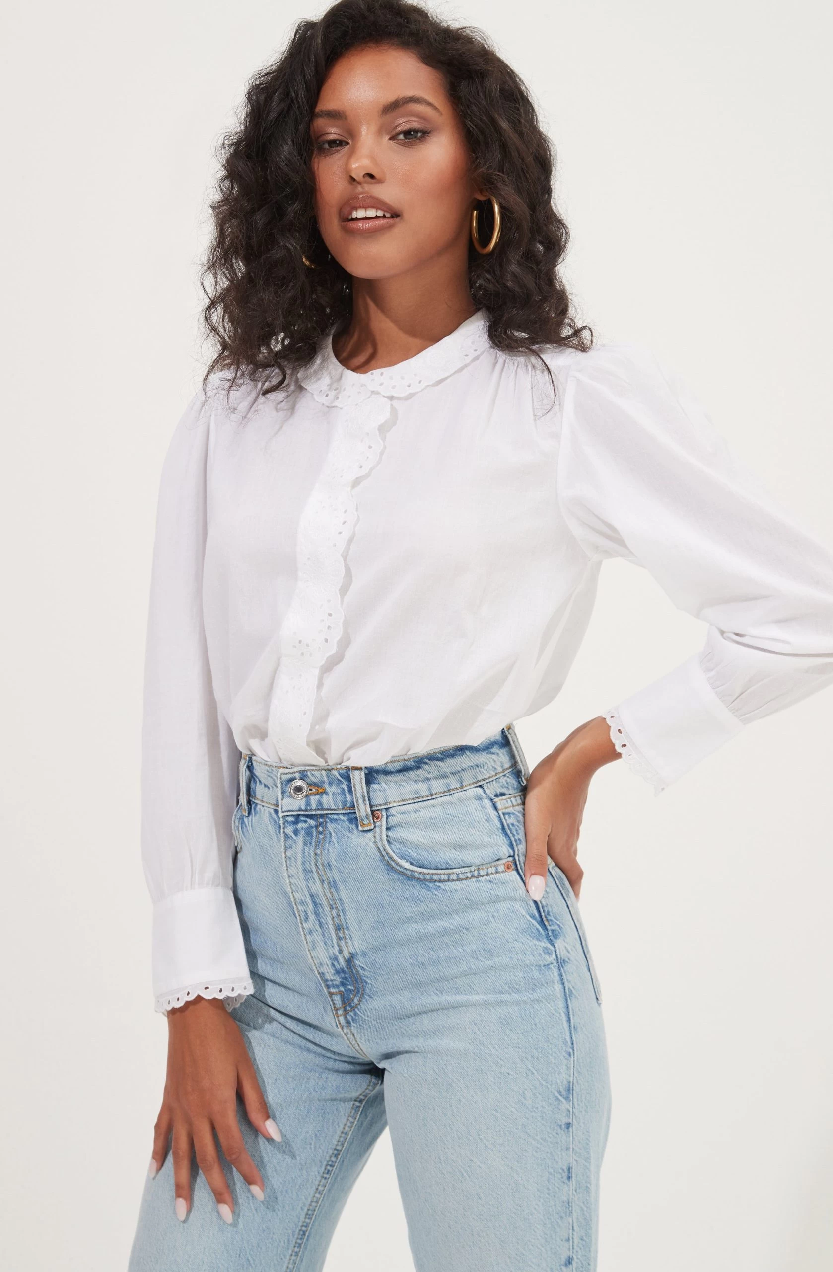 The Palmetto Top features a round collar with a scallop trim. Front button placket. Scallop trimmed cuffs. Long sleeves.
