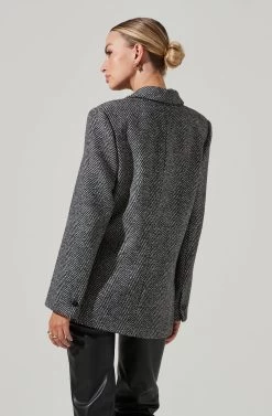 The Pauline Blazer features a chic herringbone pattern throughout. Notched collar leads to a buttoned front. Breast pocket and matching side pockets. Long sleeves.