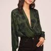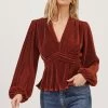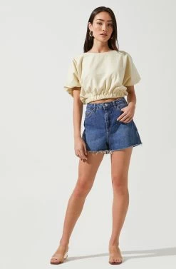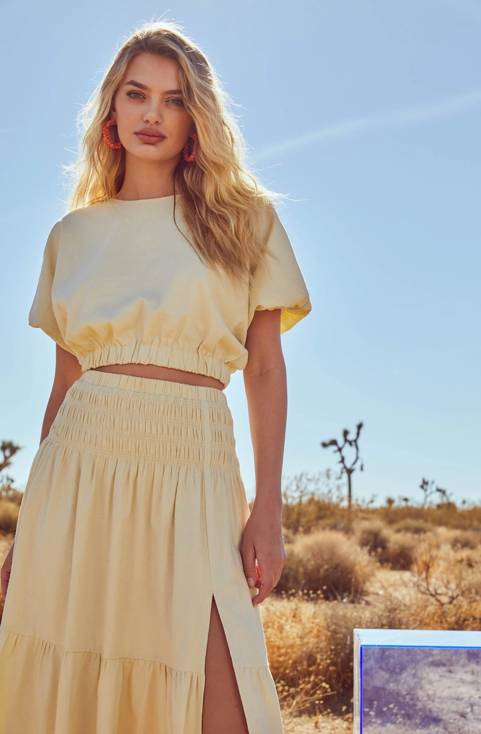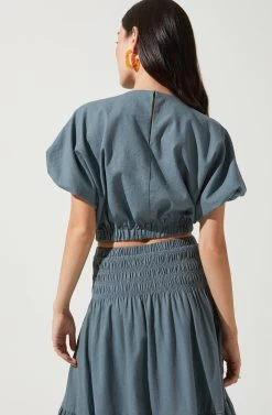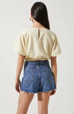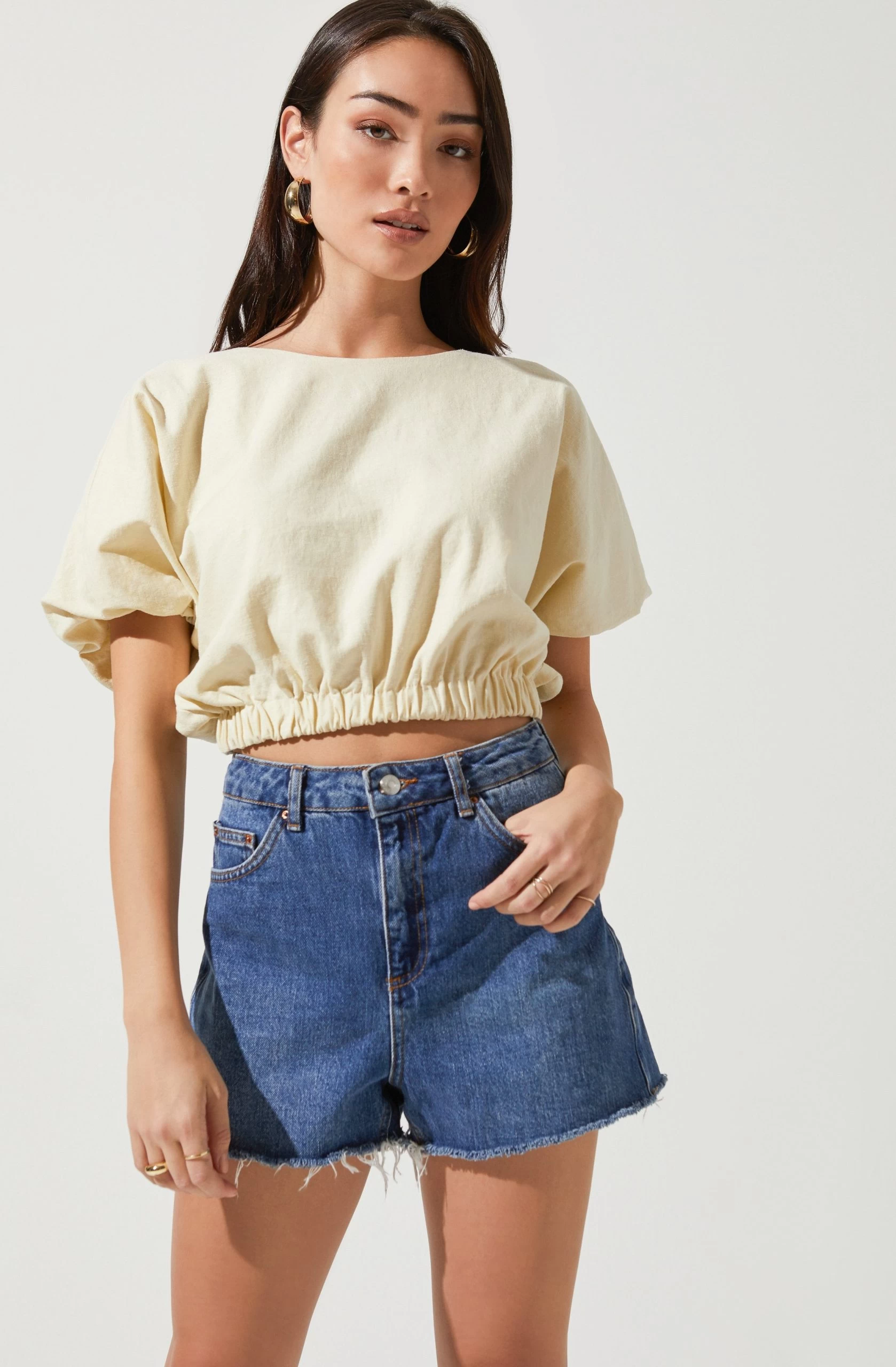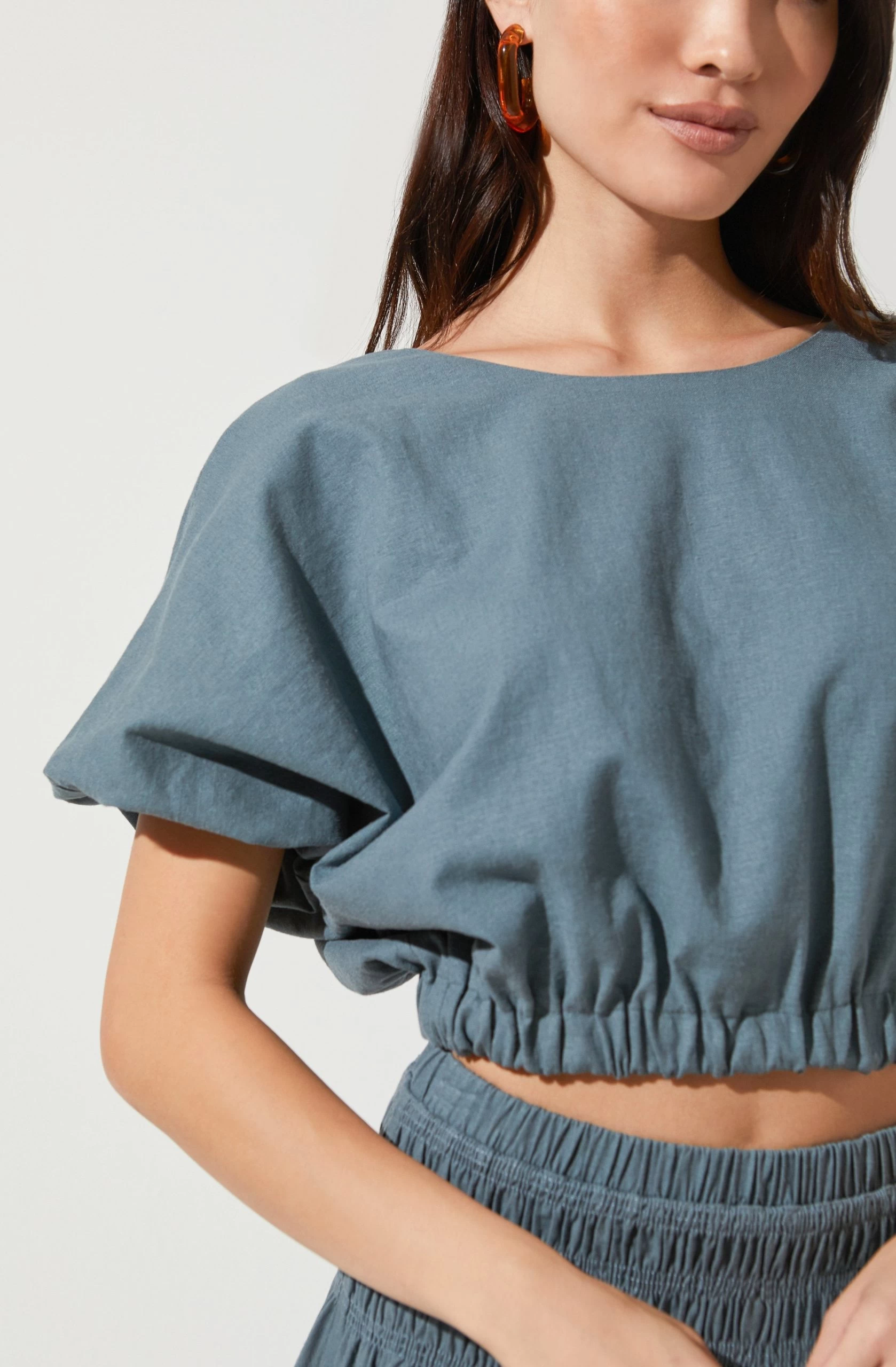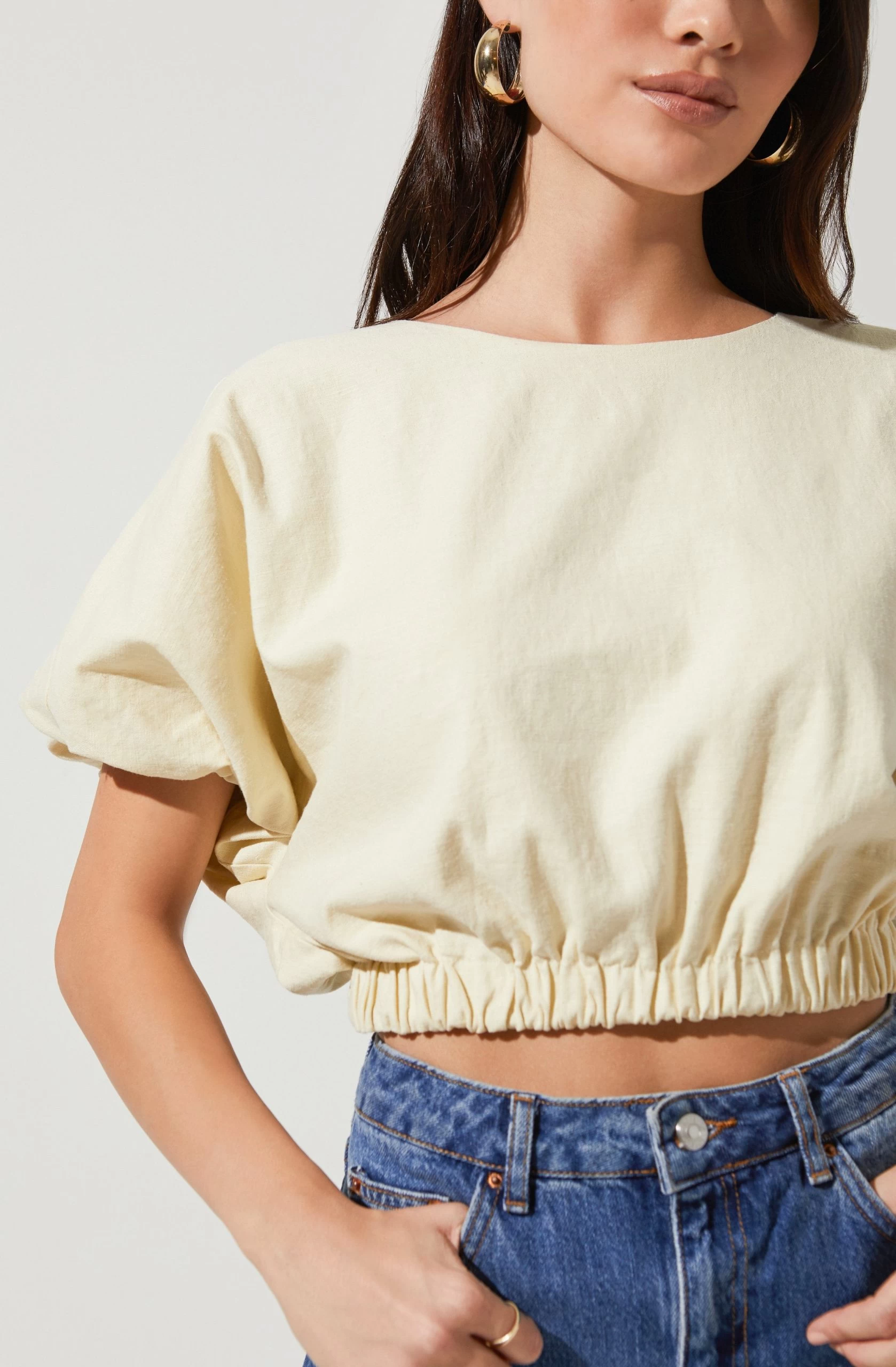 Paradise awaits. This crop top features a round collar that leads to a relaxed silhouette. Short puff sleeves. Cinched waist. Keyhole back.
