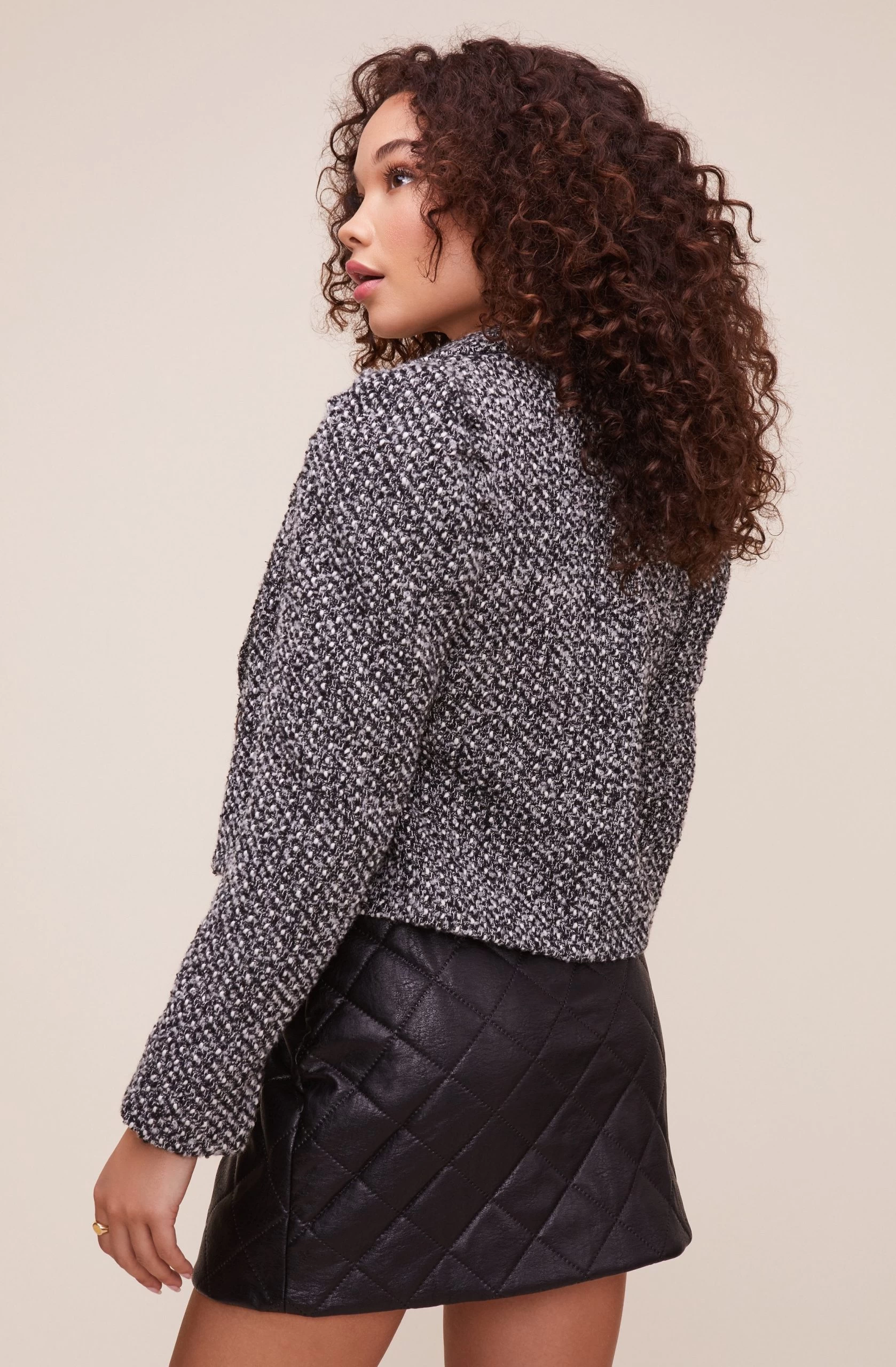 Just like a lady, the Perla Blazer gets it right! It features a cropped silhouette with bold shoulders, double breasted front and notched lapel. Tweed knit construction elevates this statement look.
