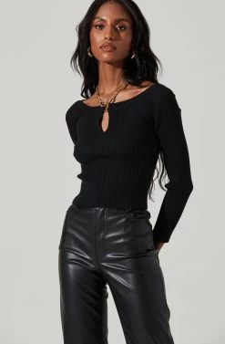 The Philippa Sweater features a ribbed knit construction. Boat neckline features a chunky gold chain accent and cutout accent. Long sleeves.