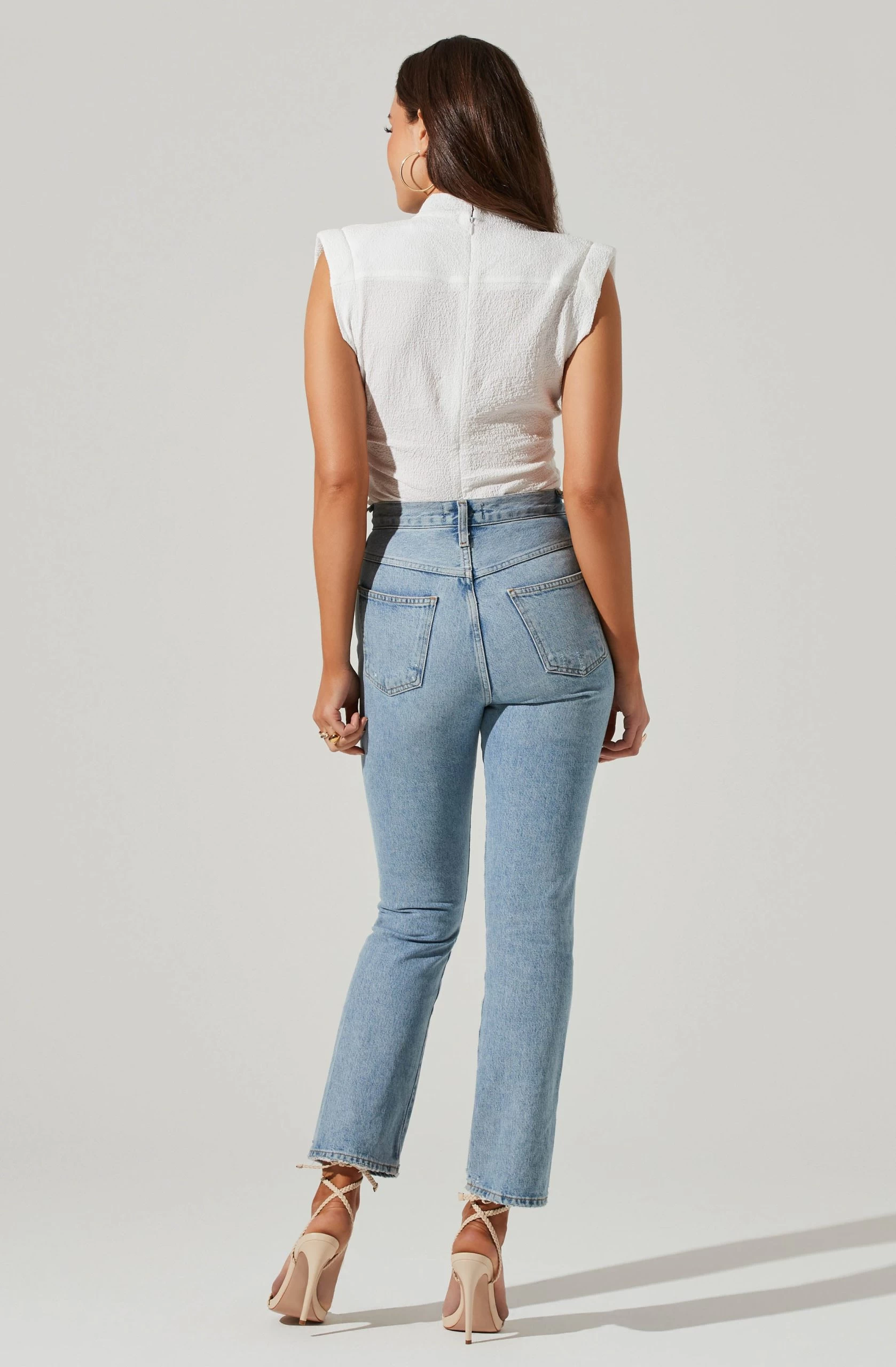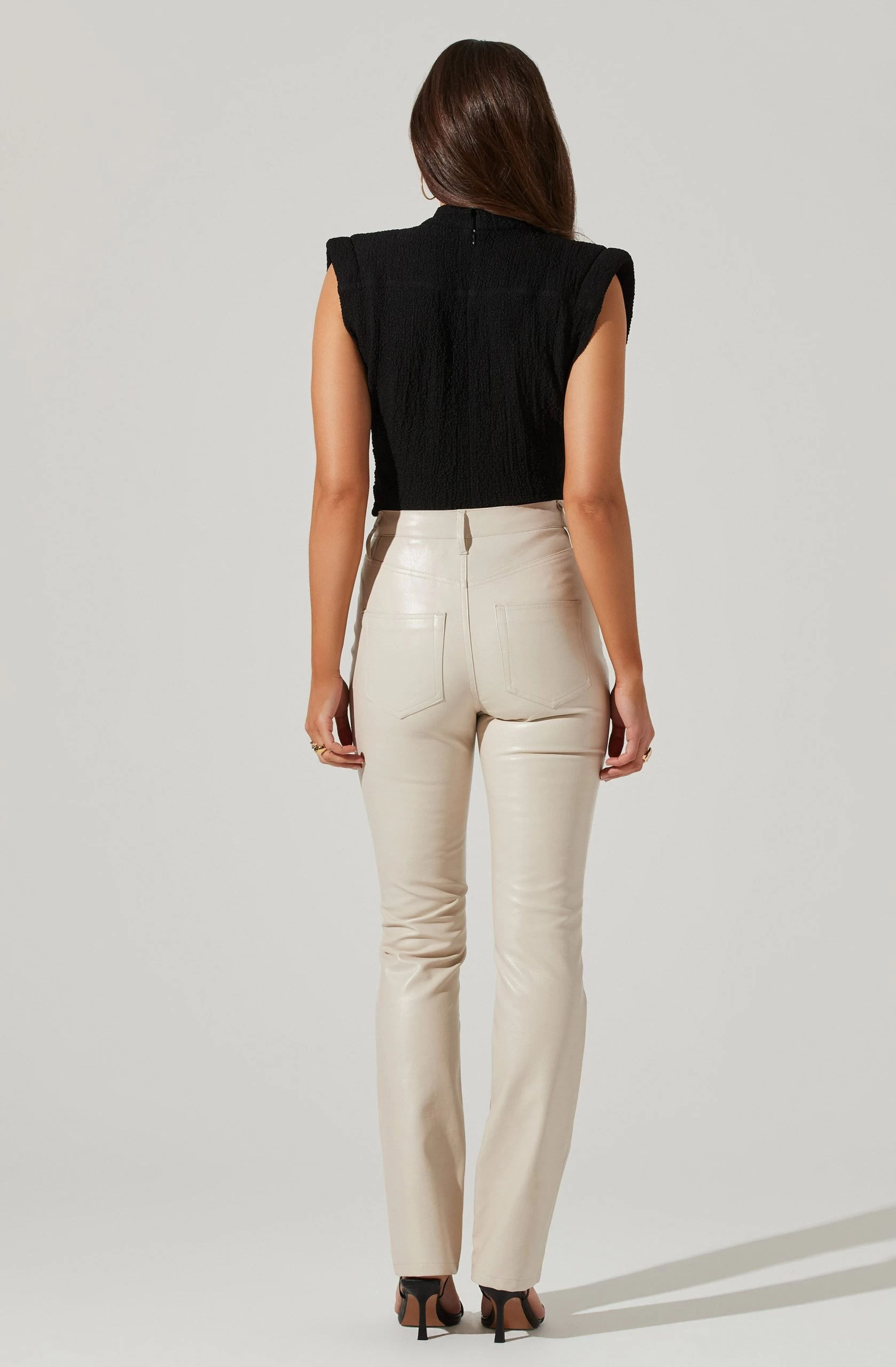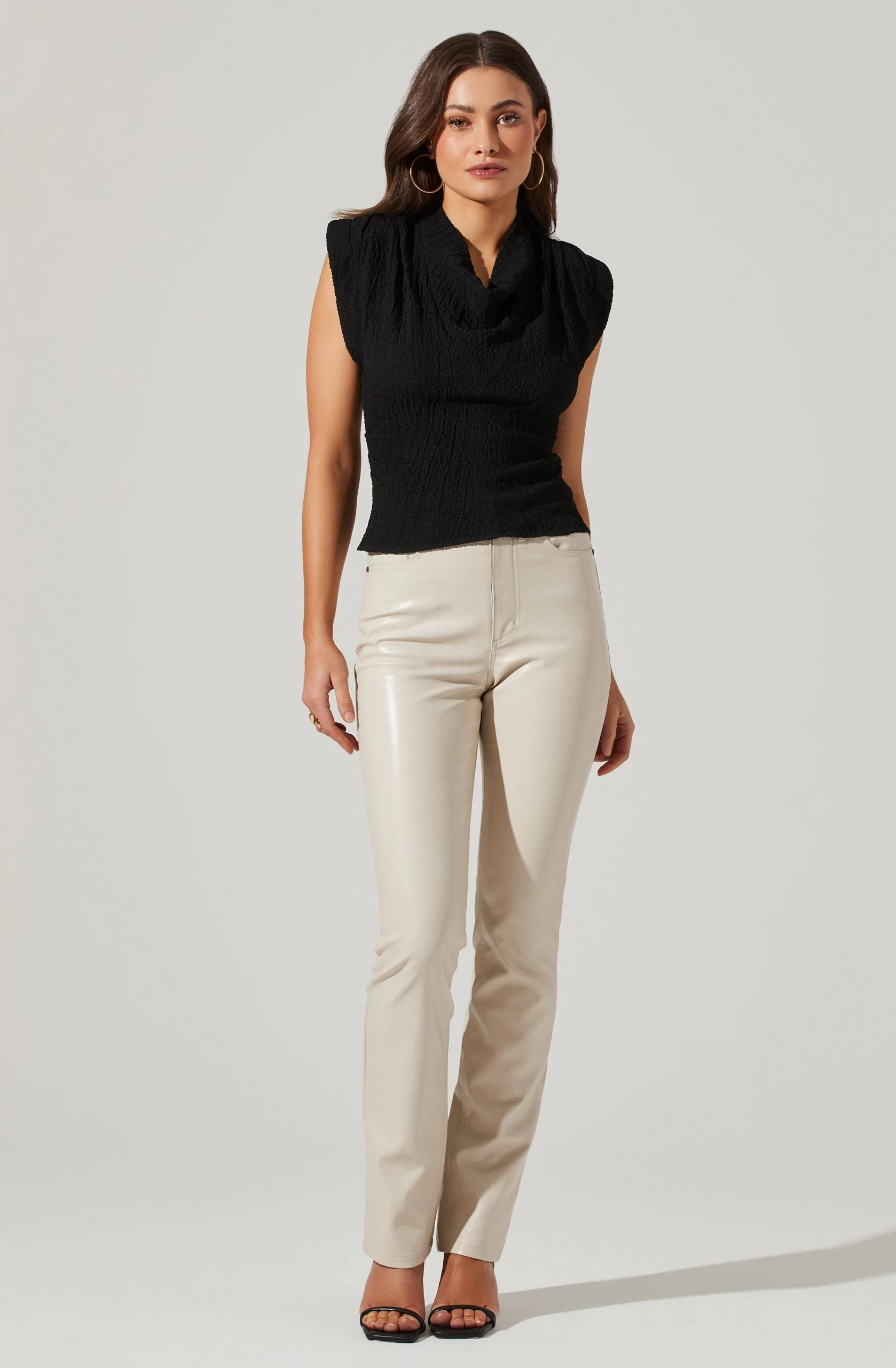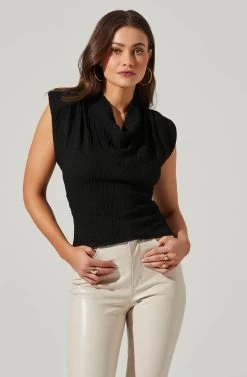 This statement top features a crinkle finish throughout. Cowl neckline features pleated accents. Padded shoulders. Fitted silhouette.