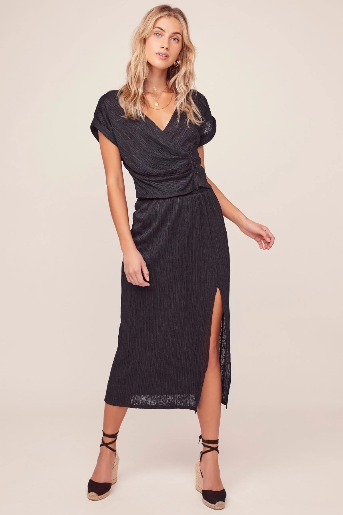 A skirt worthy of a double take! This Parisian-inspired midi features a high waist and sexy front thigh slit accent.