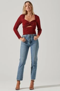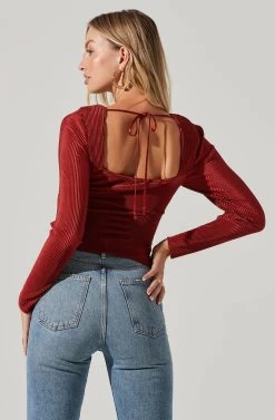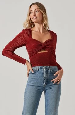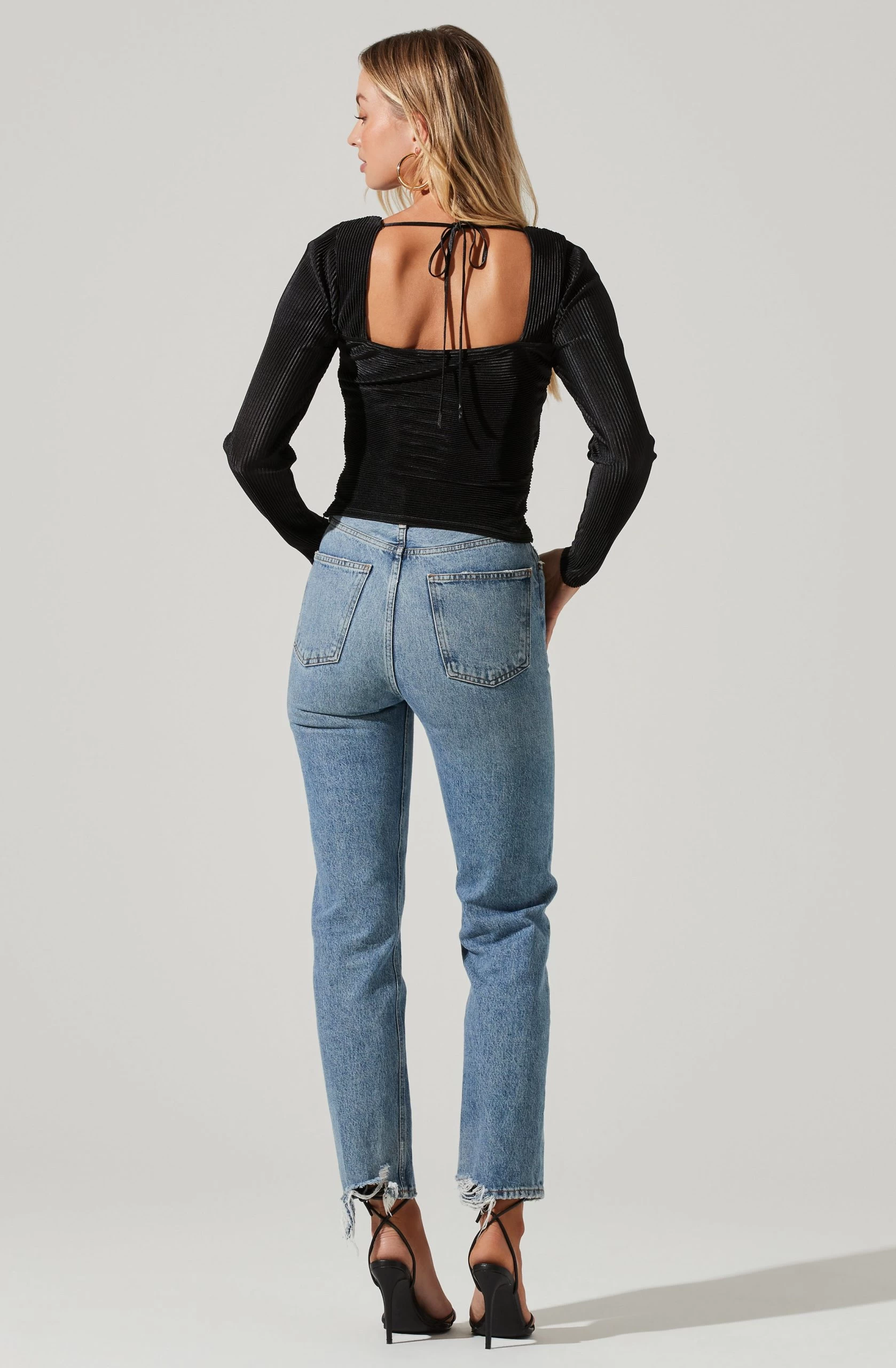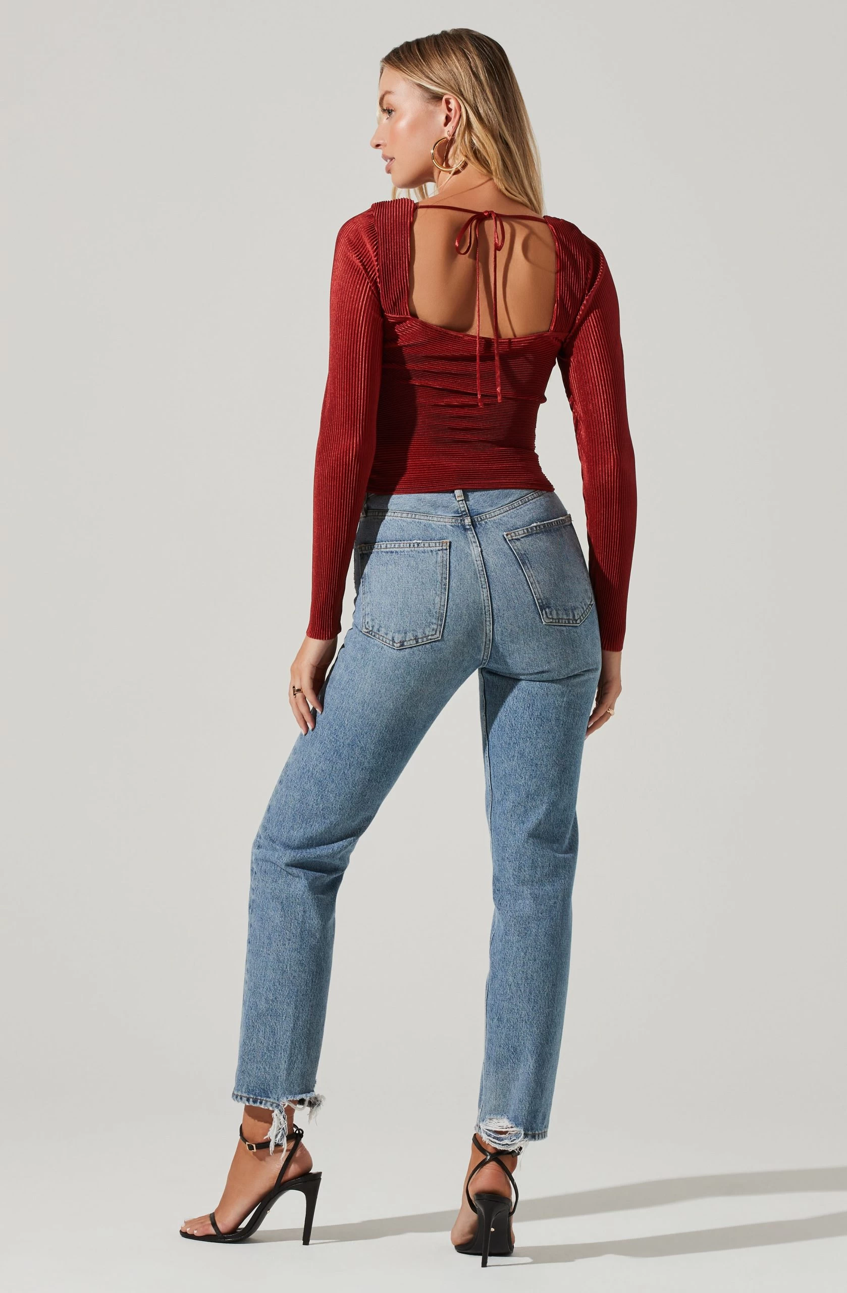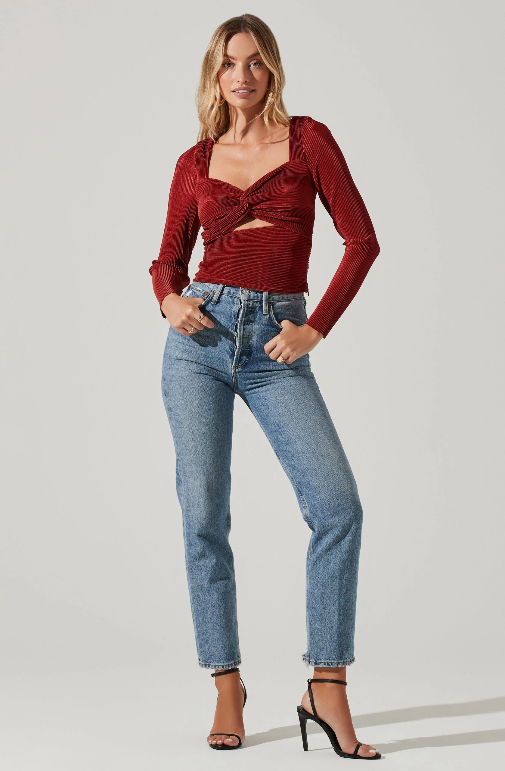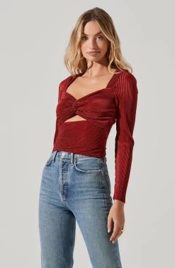 This elevated top features a plisse texture. Sweetheart neckline leads to a cutout midriff. Long sleeves. Tie strap accent on the back.
