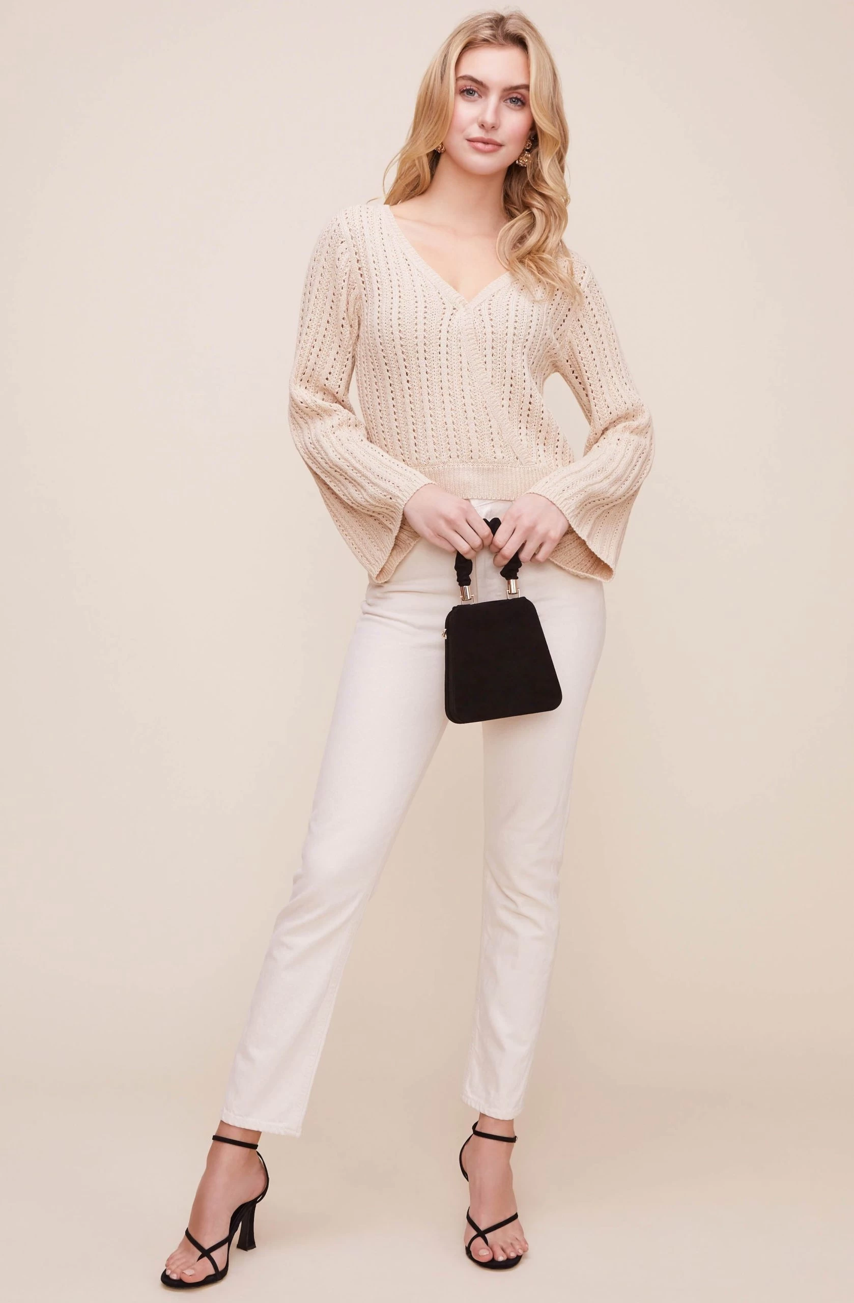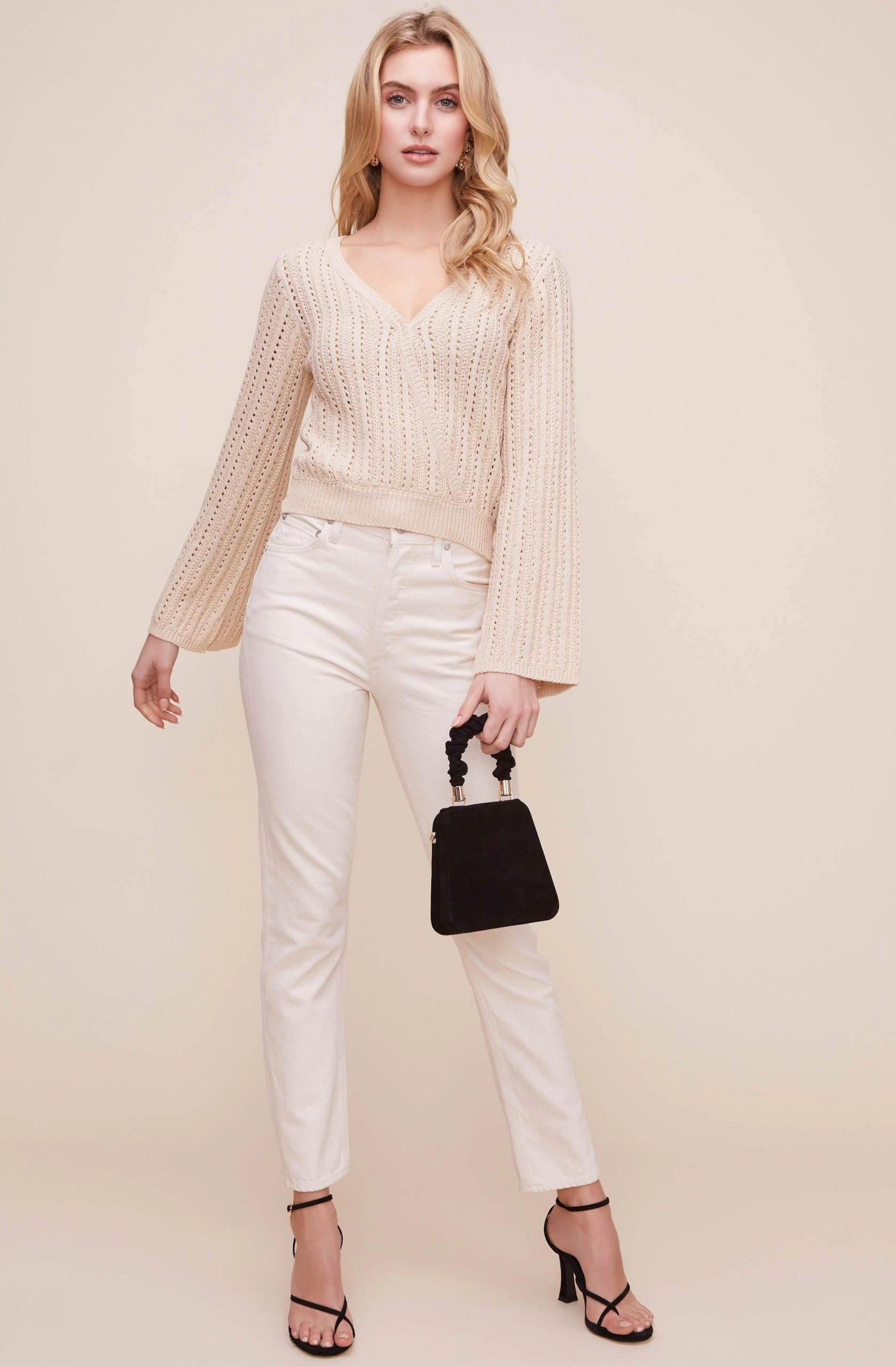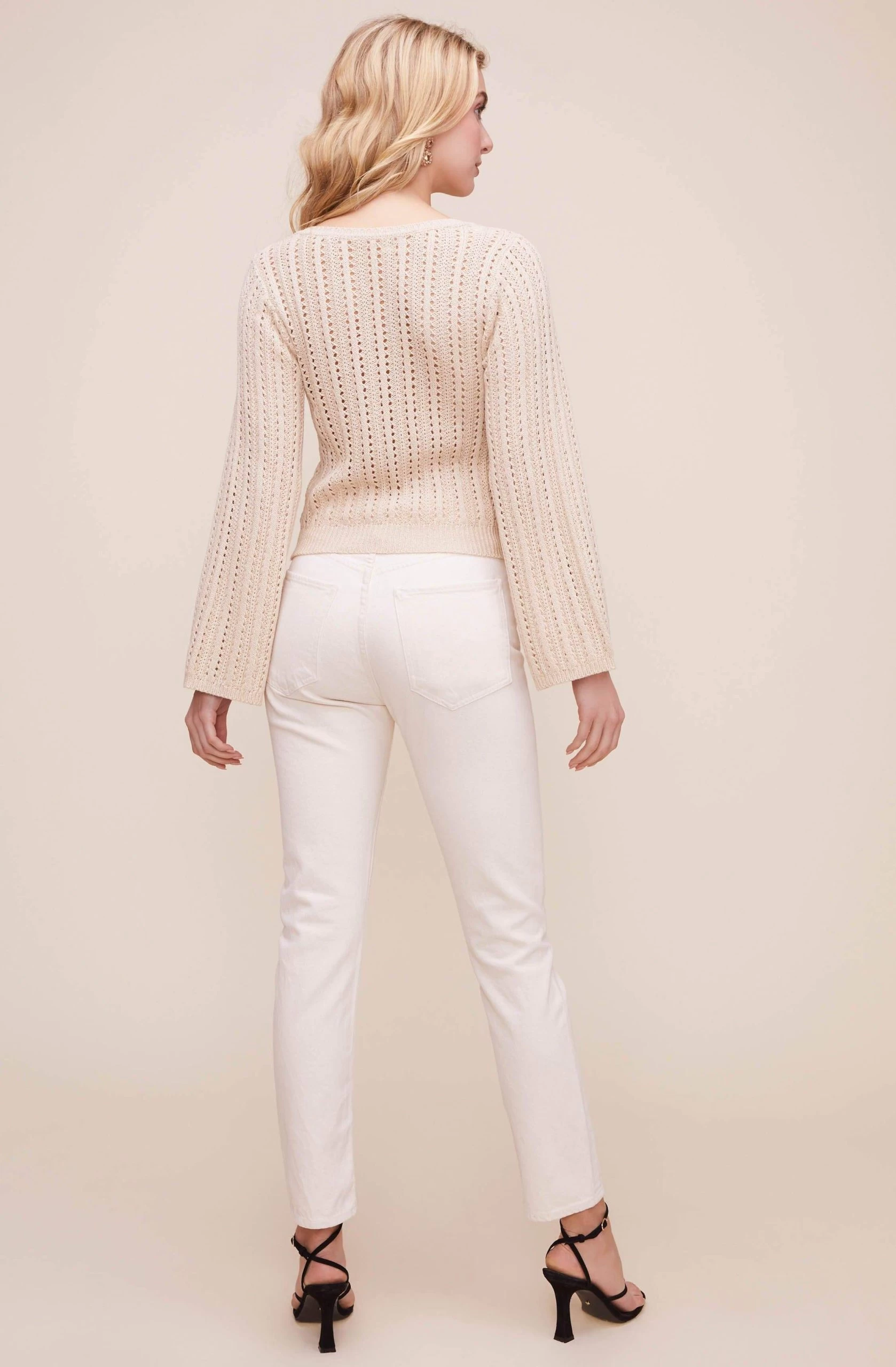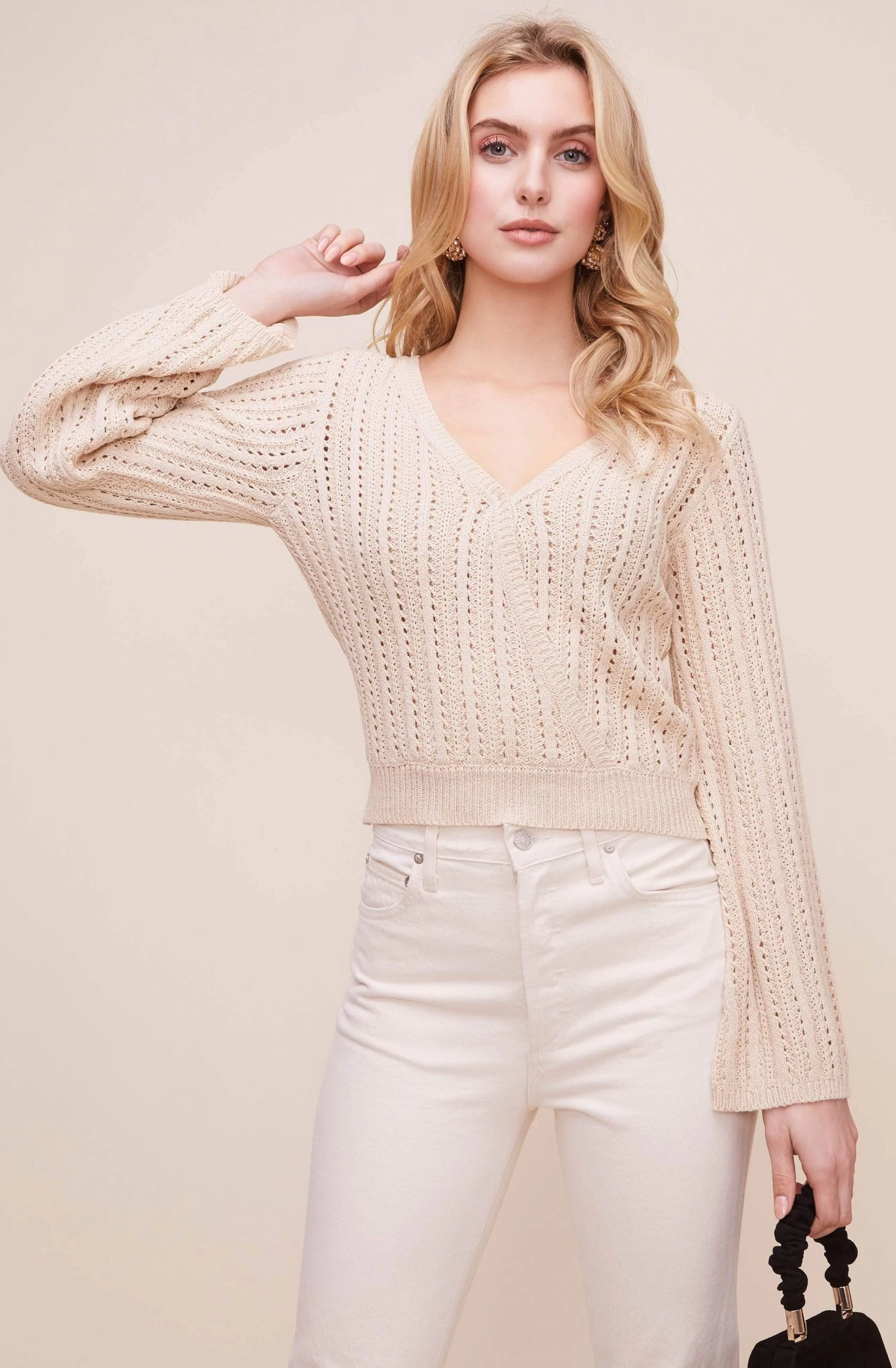 This breezy pointelle sweater features a V-neckline that leads to a wrap front and cinched waist. Long bell sleeves.
