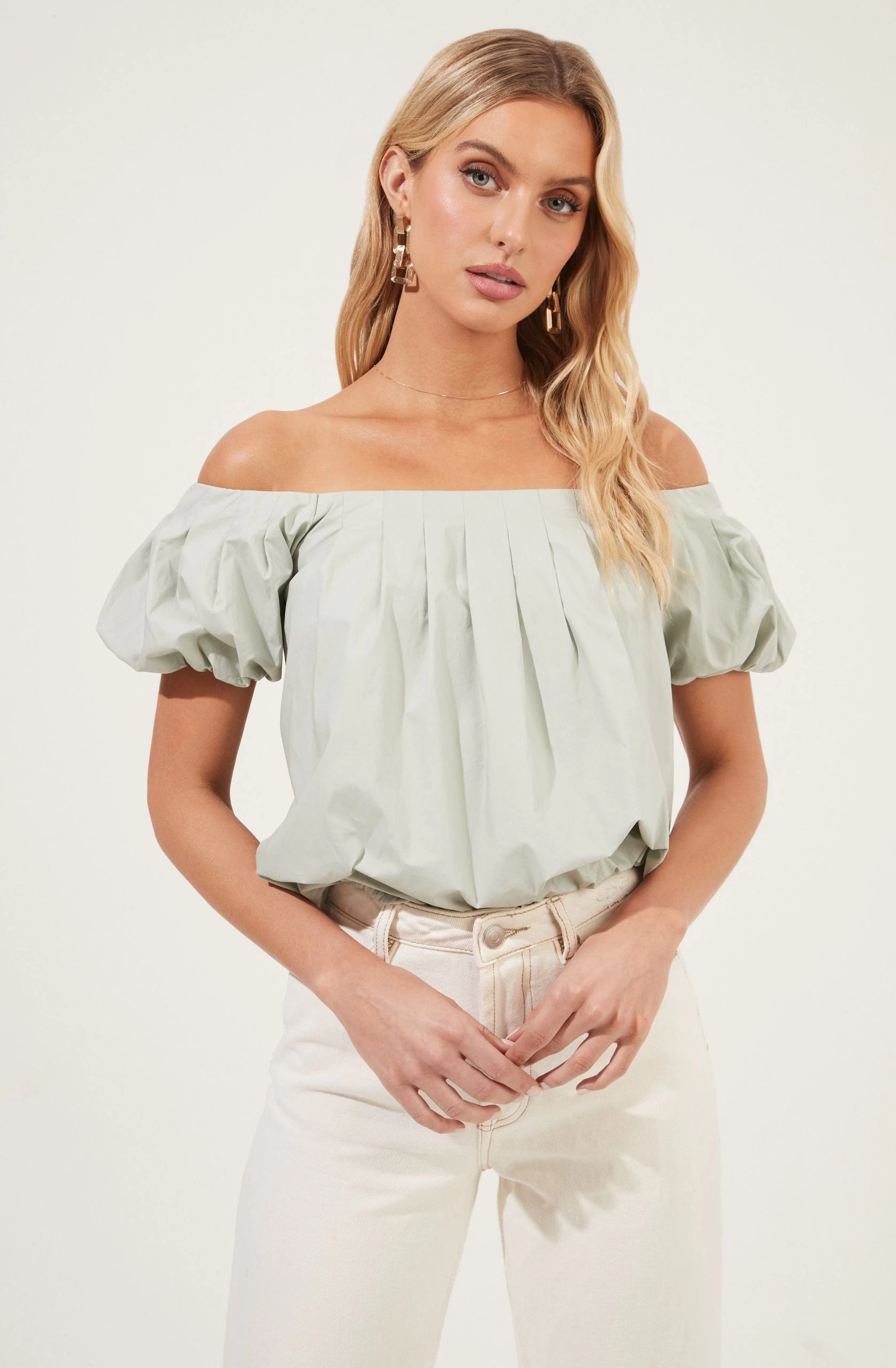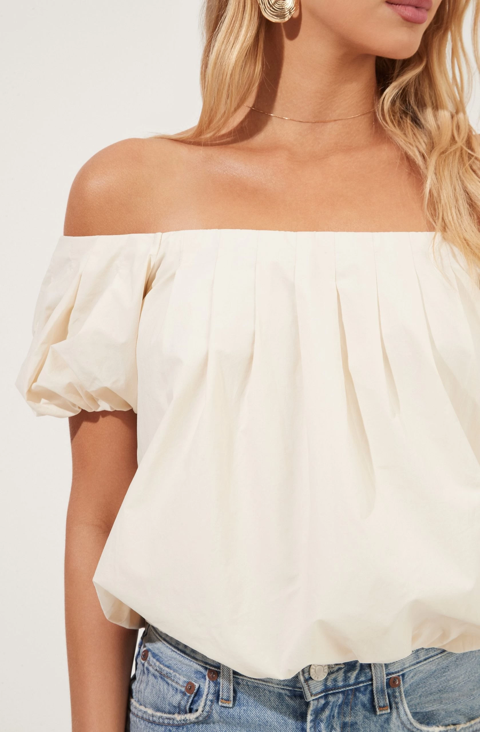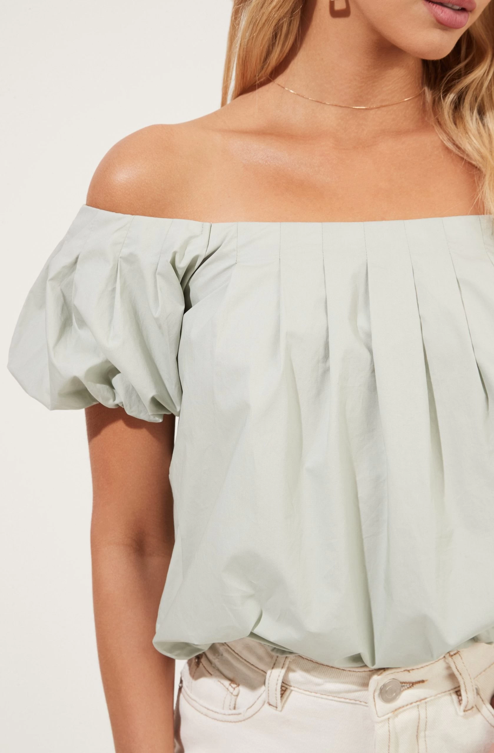 Love for style. This poplin top features an off-shoulder neckline that leads to a pleated front. Short puff sleeves and relaxed fit.