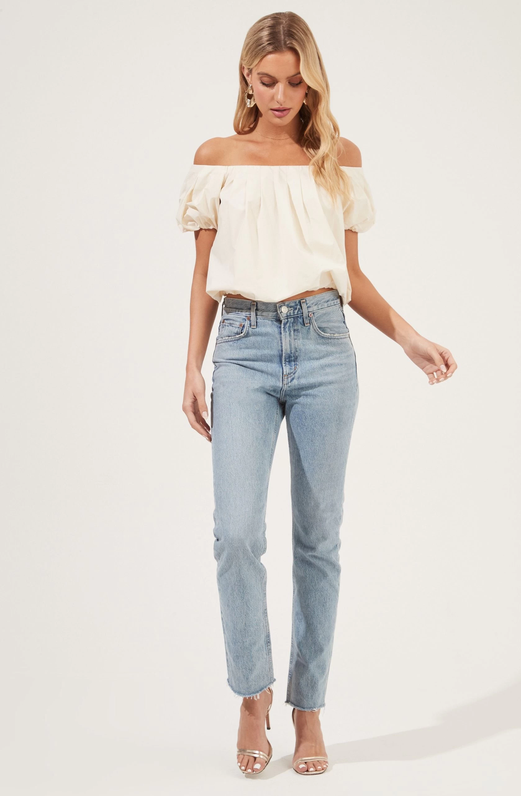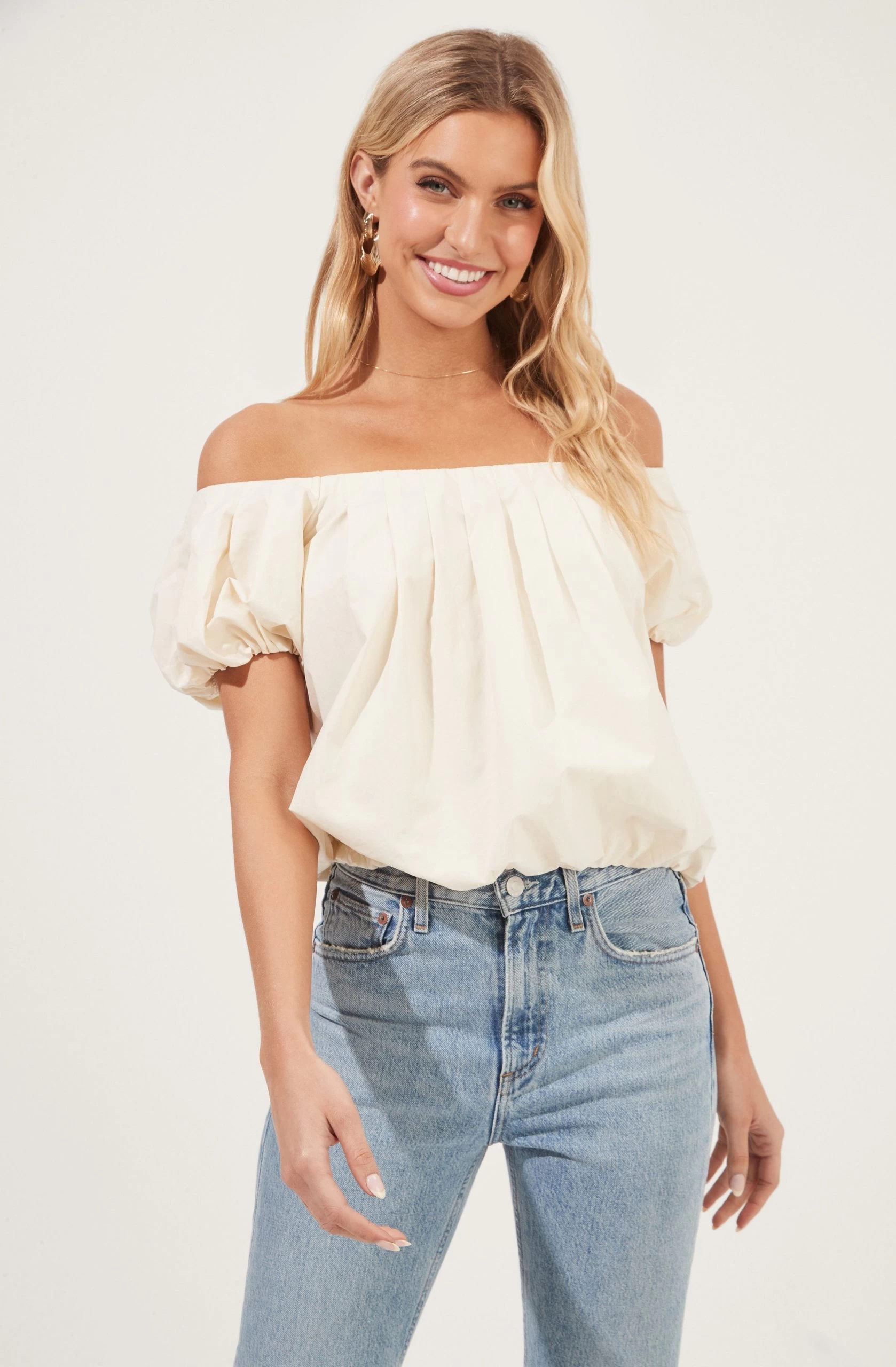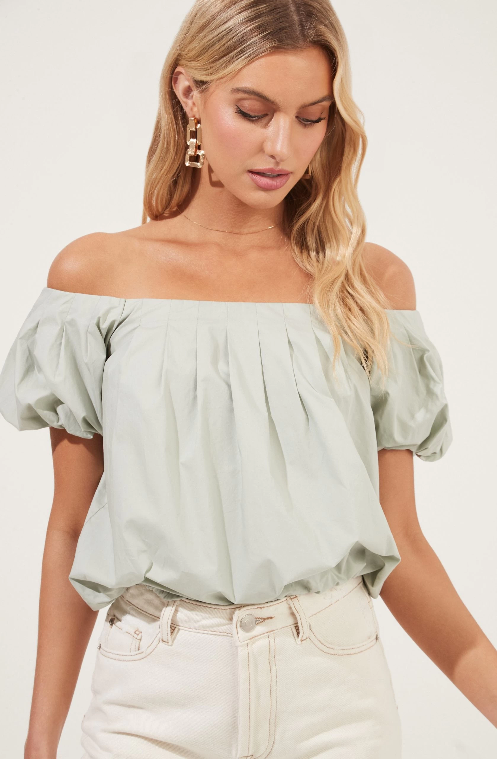 Love for style. This poplin top features an off-shoulder neckline that leads to a pleated front. Short puff sleeves and relaxed fit.