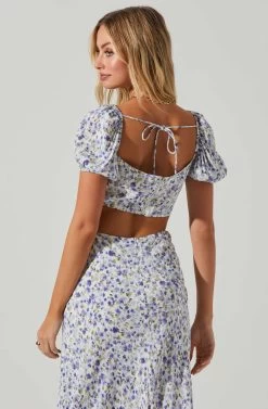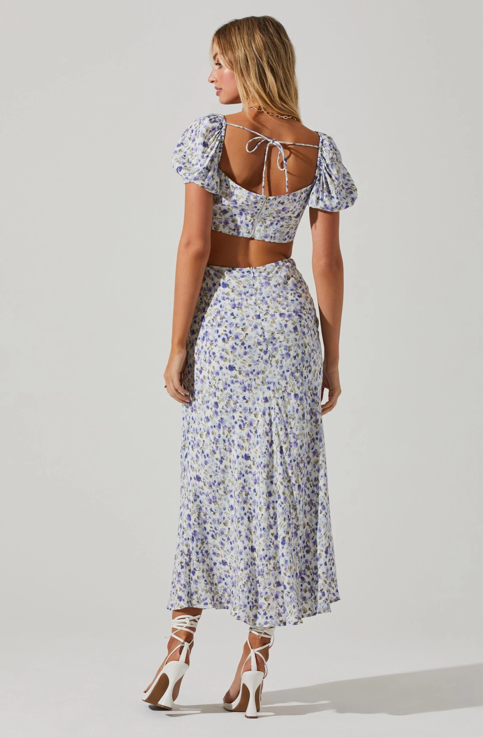 The Posie Dress features a floral print perfect for the new season. Sweetheart neckline leads to a ruched bust and cutout bodice. Midi-length skirt. Short puff sleeves. Tie back accent. Back zip closure.