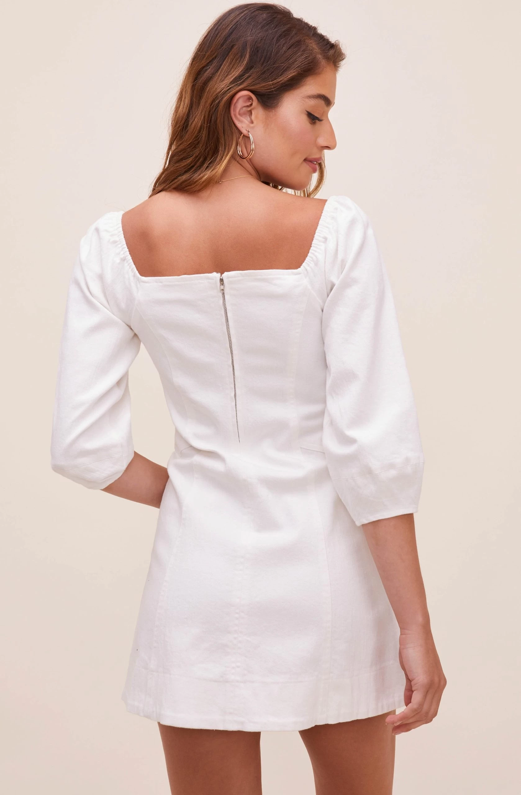 The Rabia Mini Dress features a square neckline that descends to a darted bodice and mini skirt. Quarter puff sleeves. Square cut back and back zip closure. Functional flap pockets on the front.