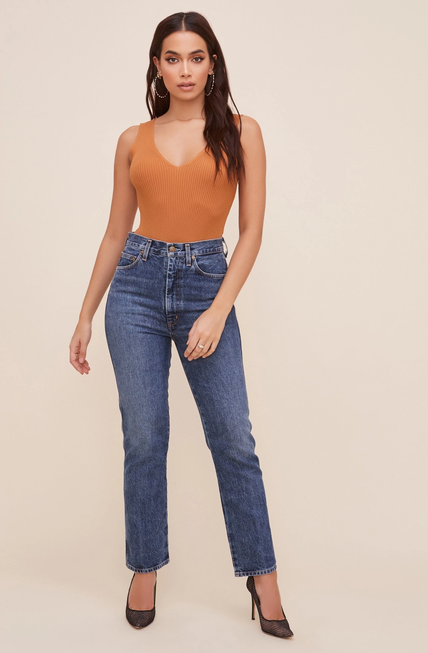 When it comes to elevated bodysuits, think knit. This classic silhouette features a sexy V neckline that leads to a ribbed knit construction that frames your figure just right. V-cut back. Sleeveless.