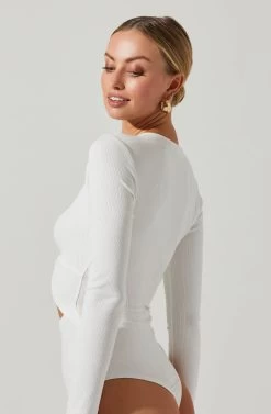The Rima Bodysuit features a double cutout design on the front with a statement knot accent. Long sleeves. Attached thong bottoms have snap button closures.