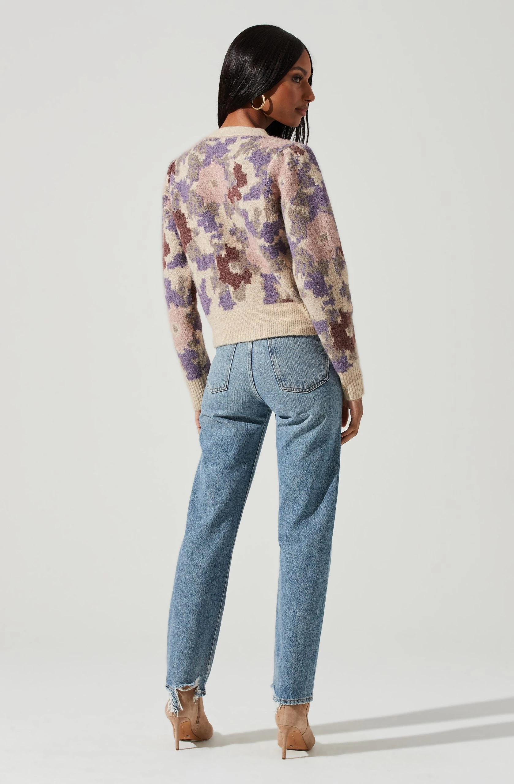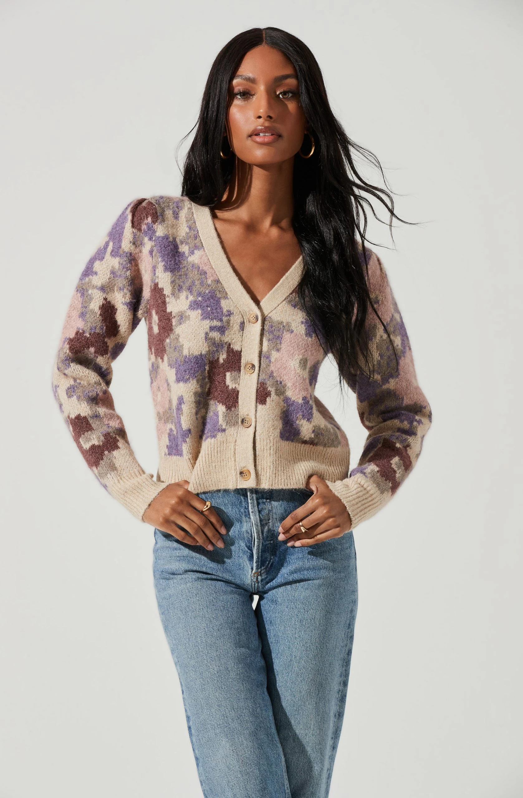 The Rosette Cardigan features a floral design that makes a statement. Contrast trim with a front button placket. Long sleeves.