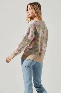 The Rosette Cardigan is a chic-yet-cozy style featuring a painterly floral design throughout. V neckline leads to a contrast button placket on the front. Dropped shoulders. Long sleeves.