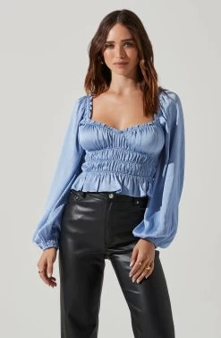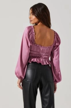 The Rowan Top features a satin finish. Sweetheart neckline leads to a smocked bodice and peplum hem. Long sleeves.