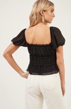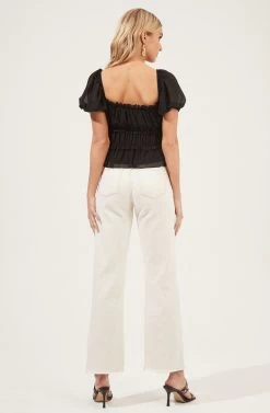 Perfect for casual days that could use a little extra style. This top features a square neckline with a ruffle trim. Smocked front and gathered bust. Short puff sleeves.