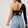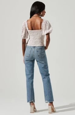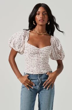 This statement print top features a subtle sweetheart neckline that leads to a ruched front. Short puff sleeves. Smocked back.