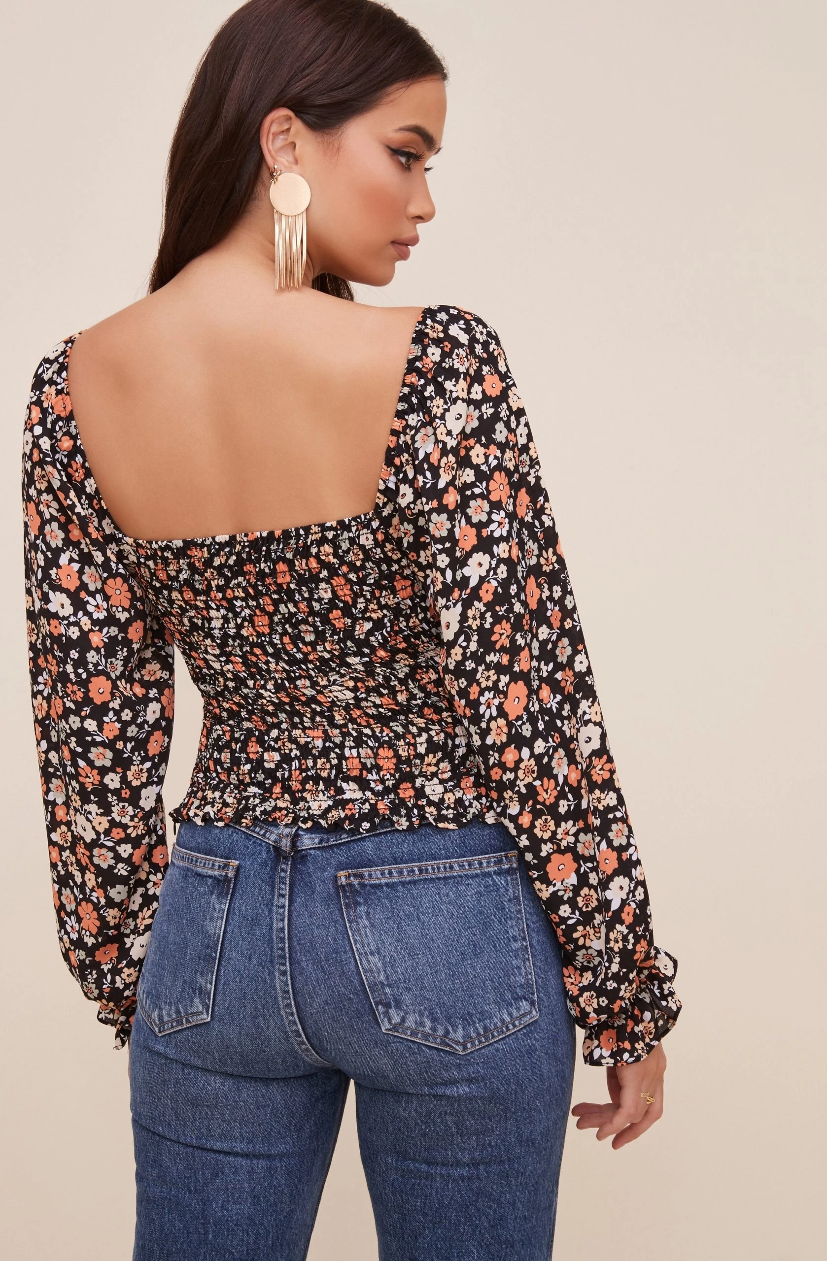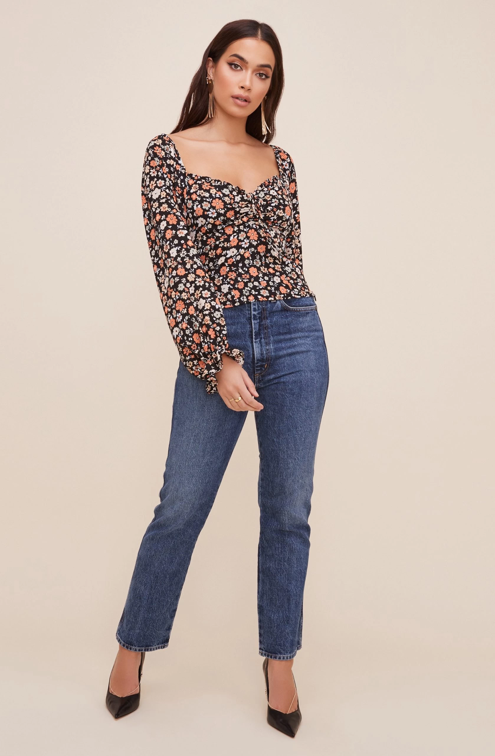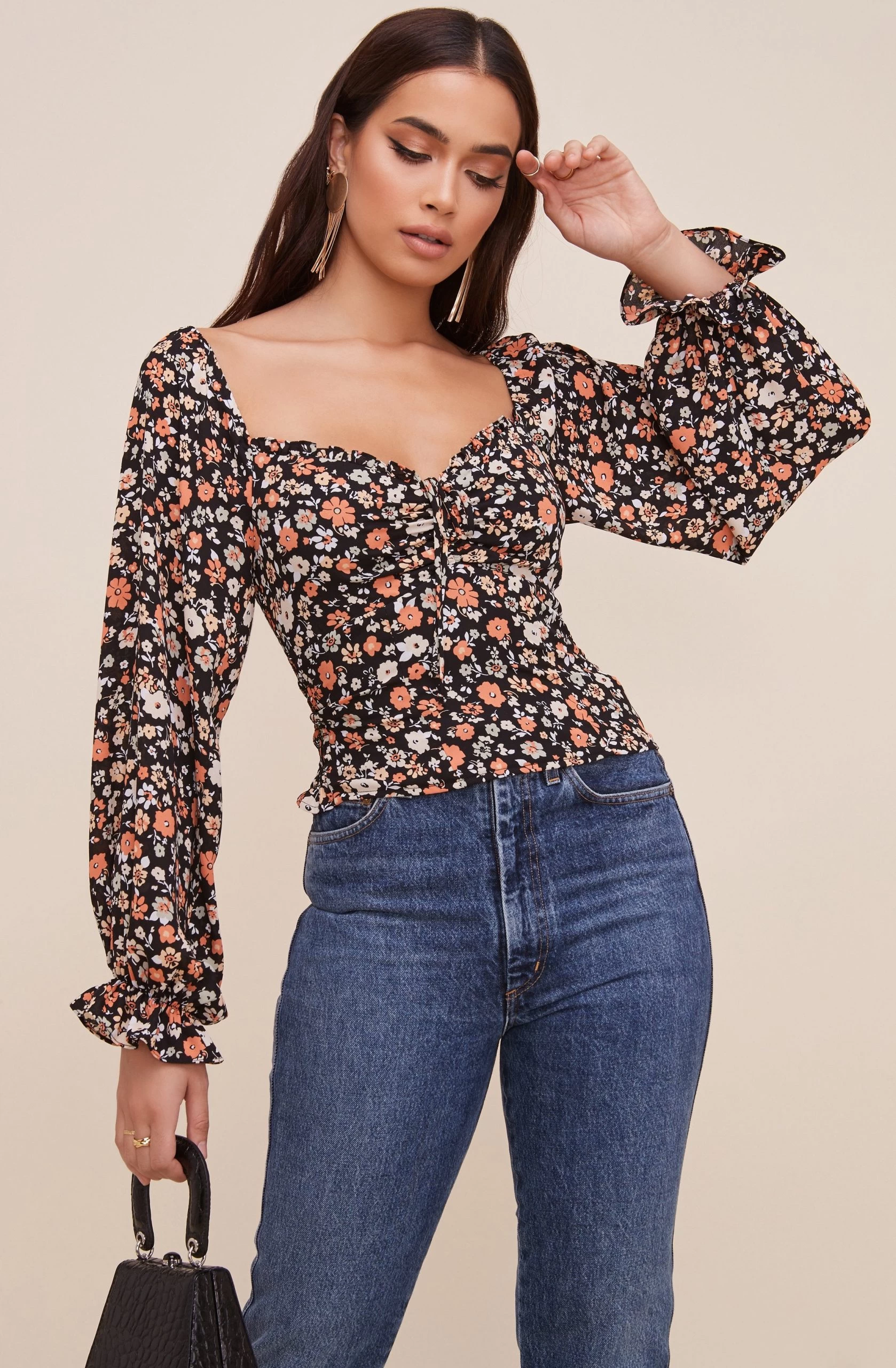 Top off your look with florals. This romantic top features a sweetheart neckline with ruffle trim. Ruching at the bust with a drawstring accent. Smocked back. Long voluminous puff sleeves.