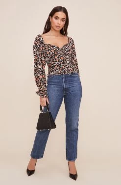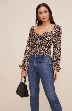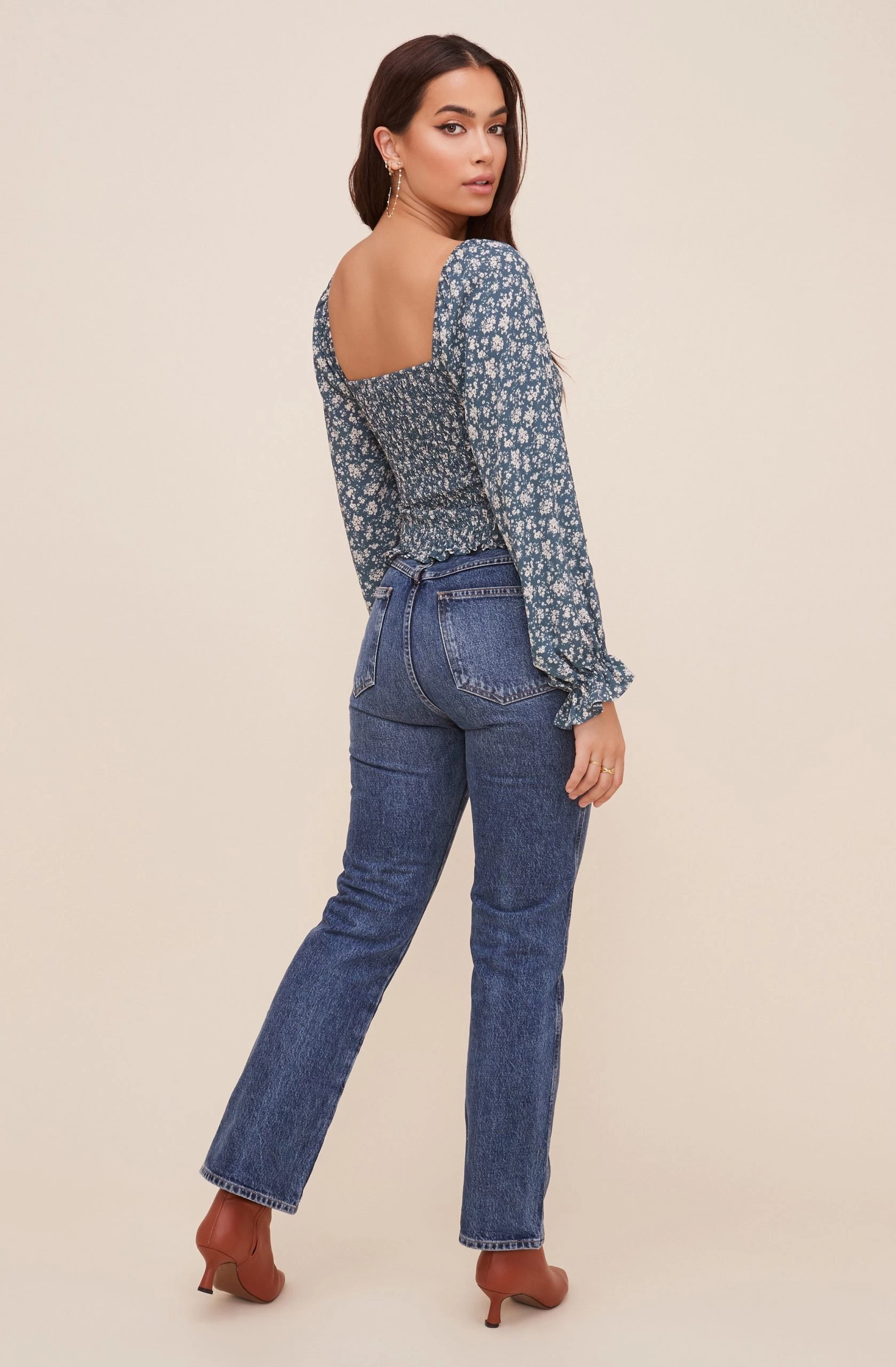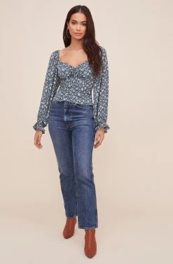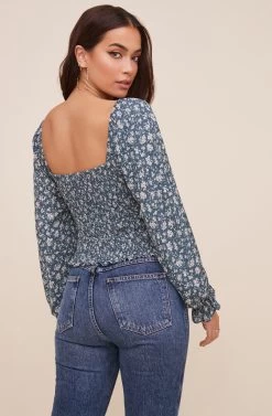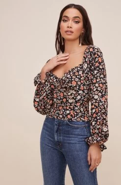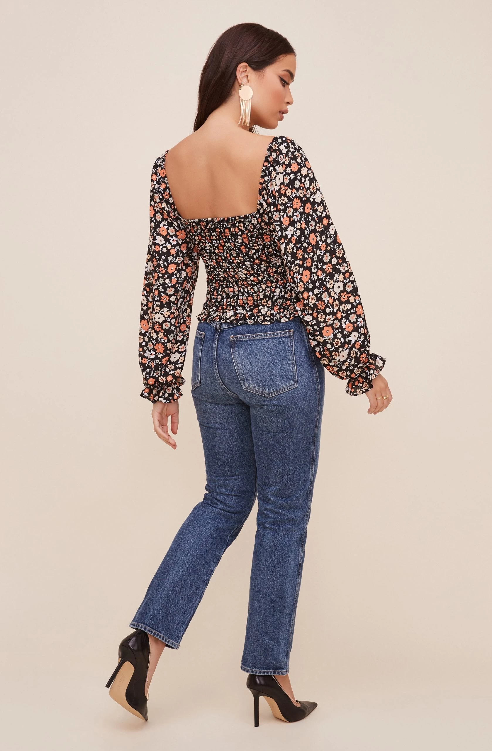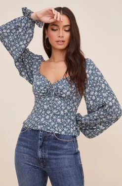 Top off your look with florals. This romantic top features a sweetheart neckline with ruffle trim. Ruching at the bust with a drawstring accent. Smocked back. Long voluminous puff sleeves.
