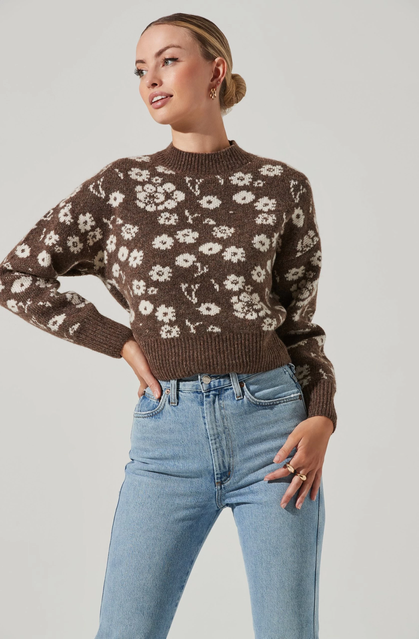 This cozy sweater features a statement floral pattern throughout. Contrast trim collar and cuffs. Long sleeves.