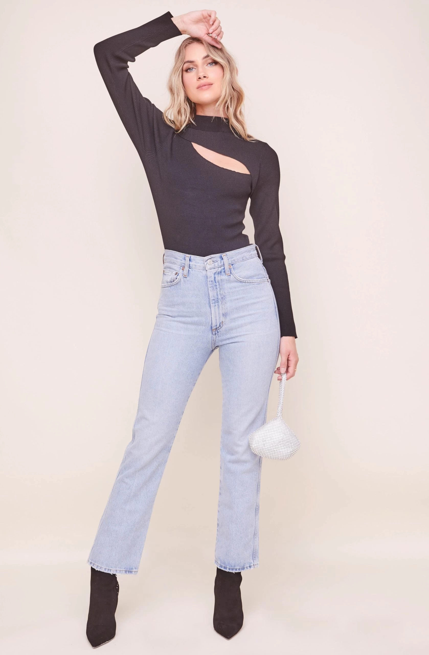 Make a statement. The Sandra Bodysuit features a ribbed knit construction that starts with a mock neck collar and leads to an eye-catching cutout accent. Long, fitted sleeves.