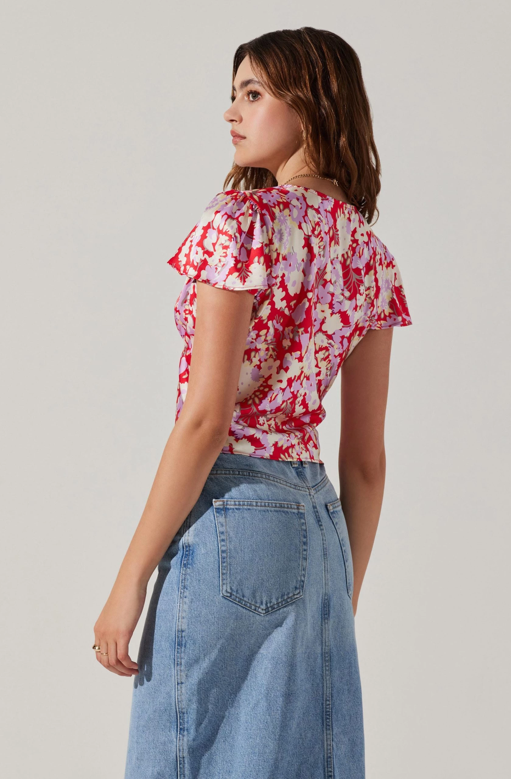 Satin V Neck Flutter Sleeve Top