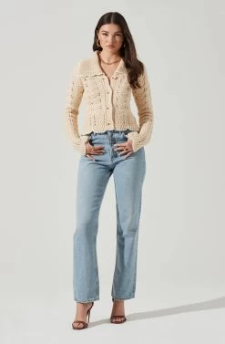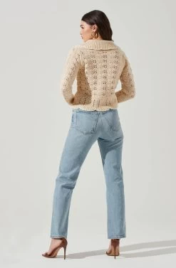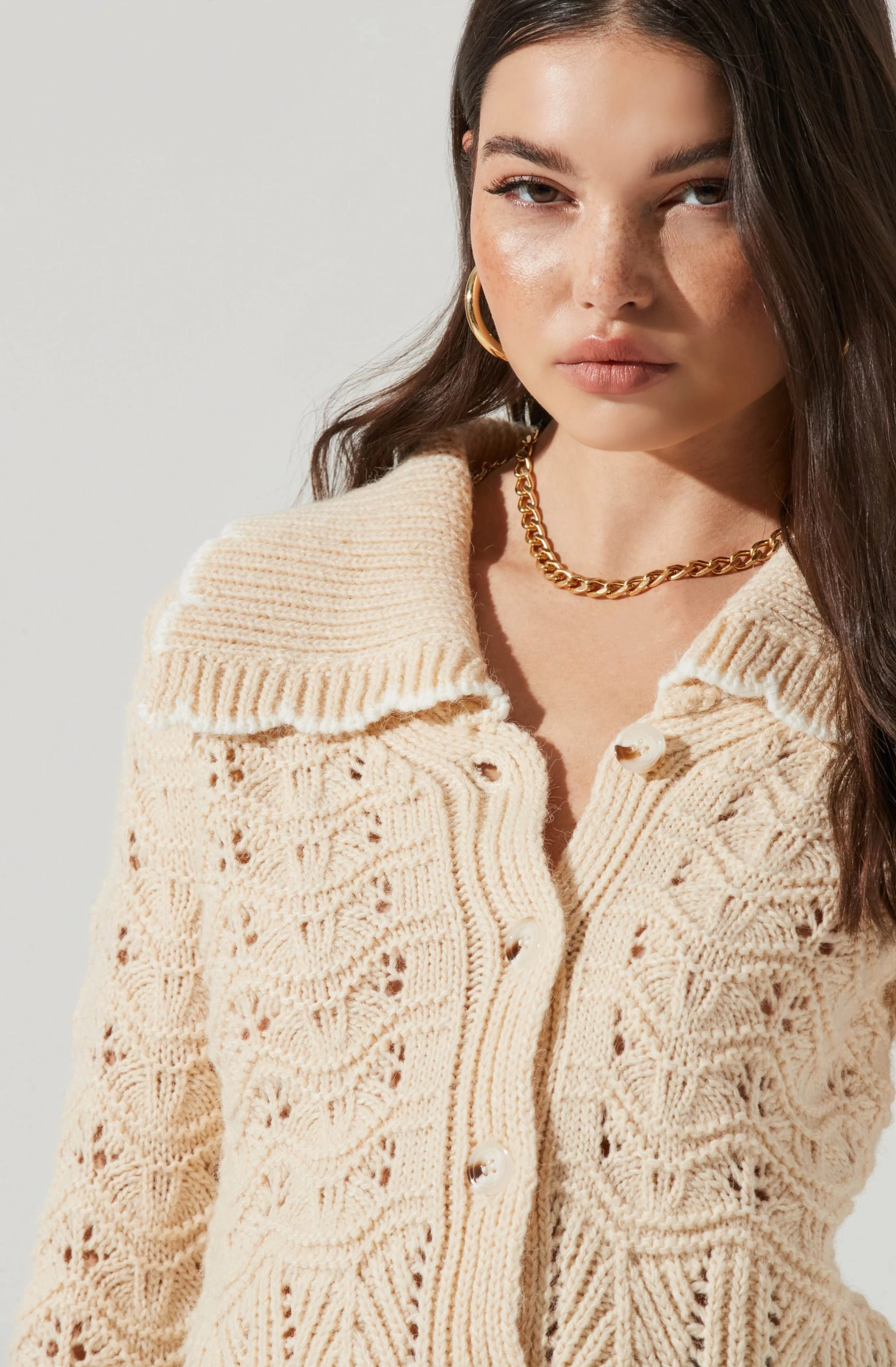 Statement cardigans are where it’s at! It features an oversized scalloped collar, front button placket and pointelle knit design. Long sleeves.