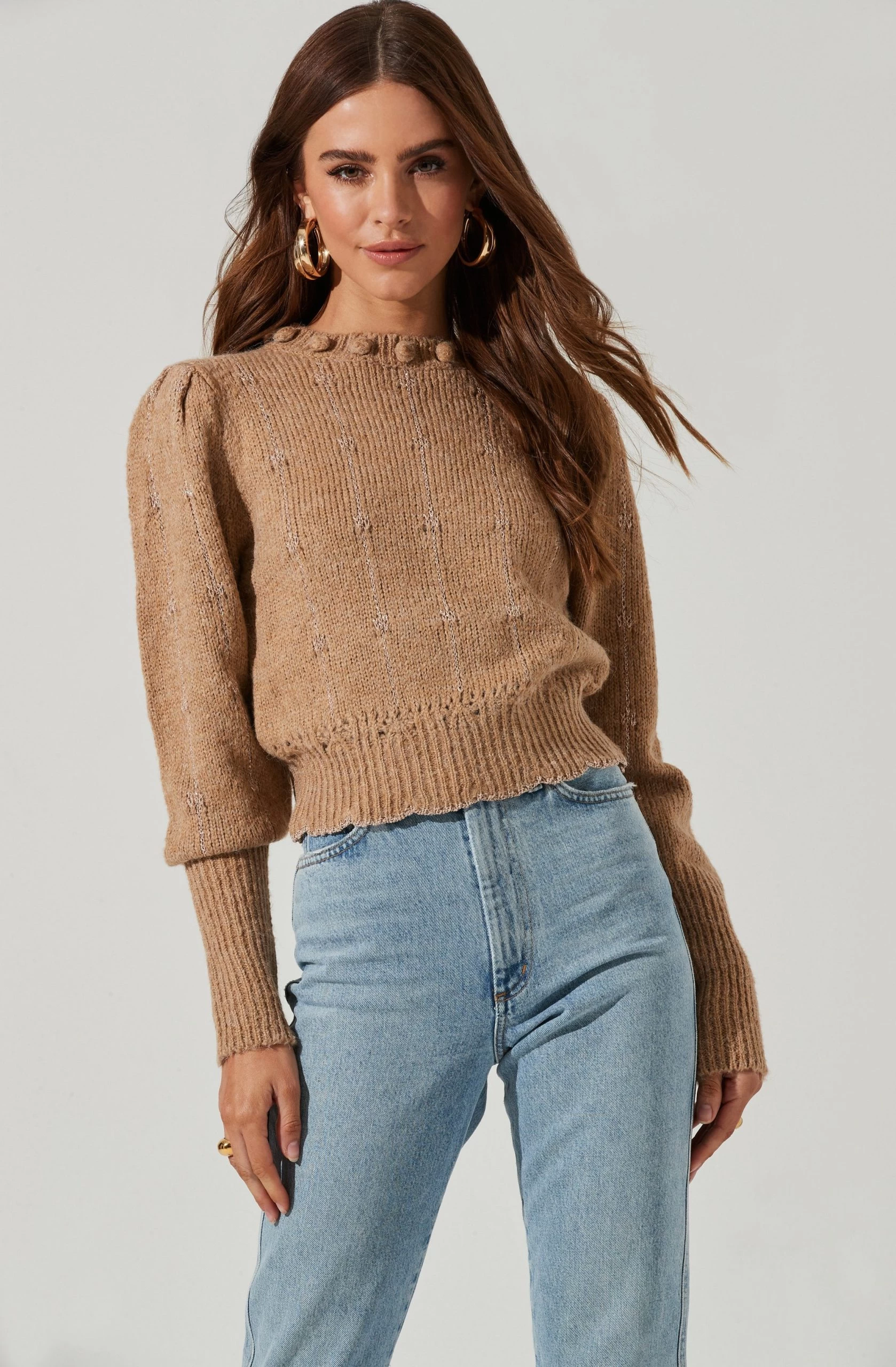Cozy up in elevated knits! This sweater features a round collar with pom pom accents. Stripe pattern features metallic thread accents. Long sleeves with puff shoulders. Scalloped hem.