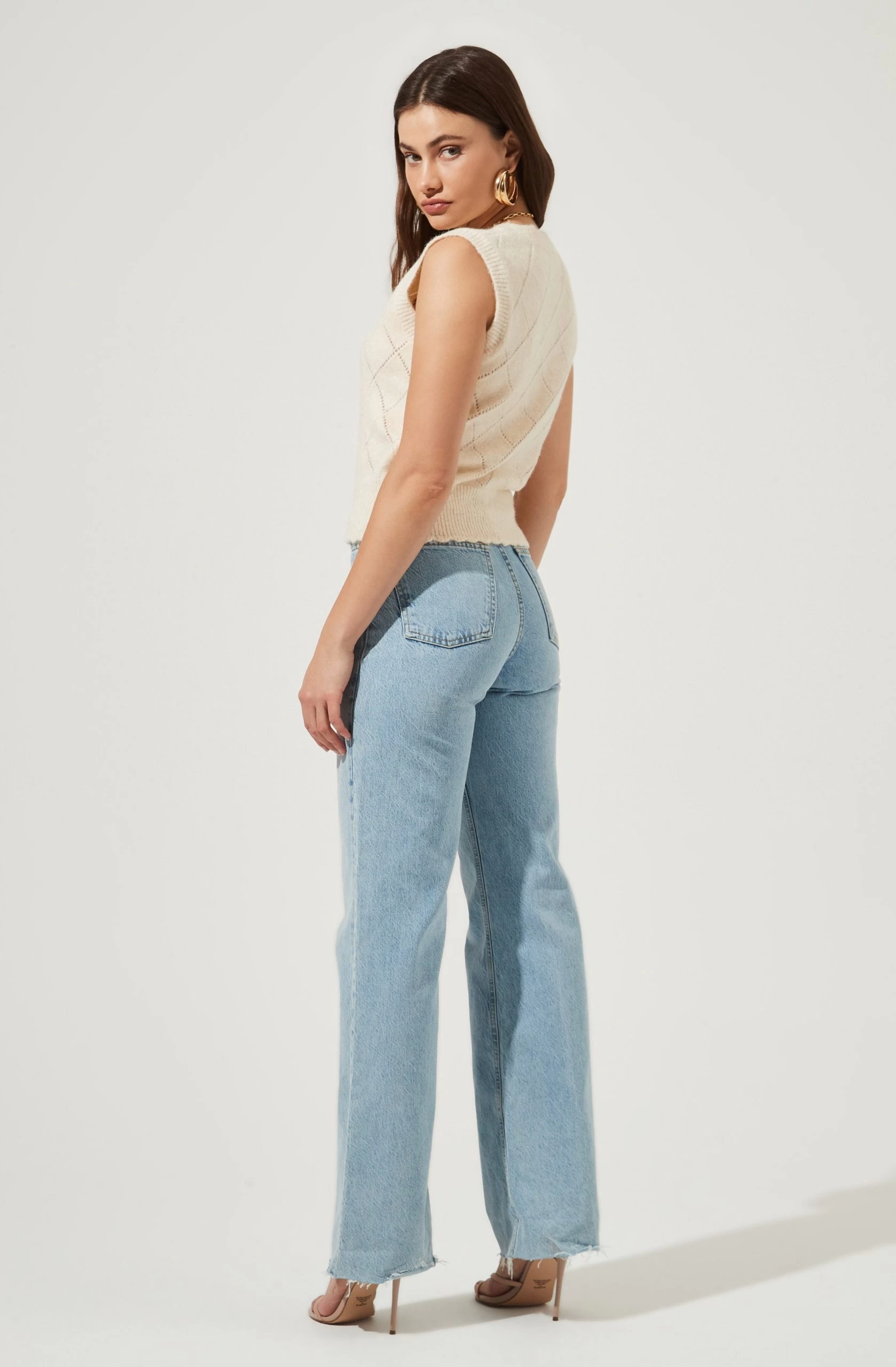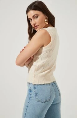 This sweet sweater vest features a V neckline and sleeveless design. Pointelle design along the front and back in an argyle pattern. Scalloped hem.