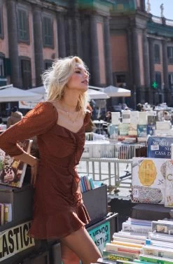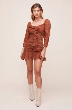 It’s all about fall for the Sephra dress. This silhouette features a square neckline that leads to a shirred bodice with a cascading ruffle trim detail along the front. Pleated mini skirt. Long sheer sleeves with shirred detailing.