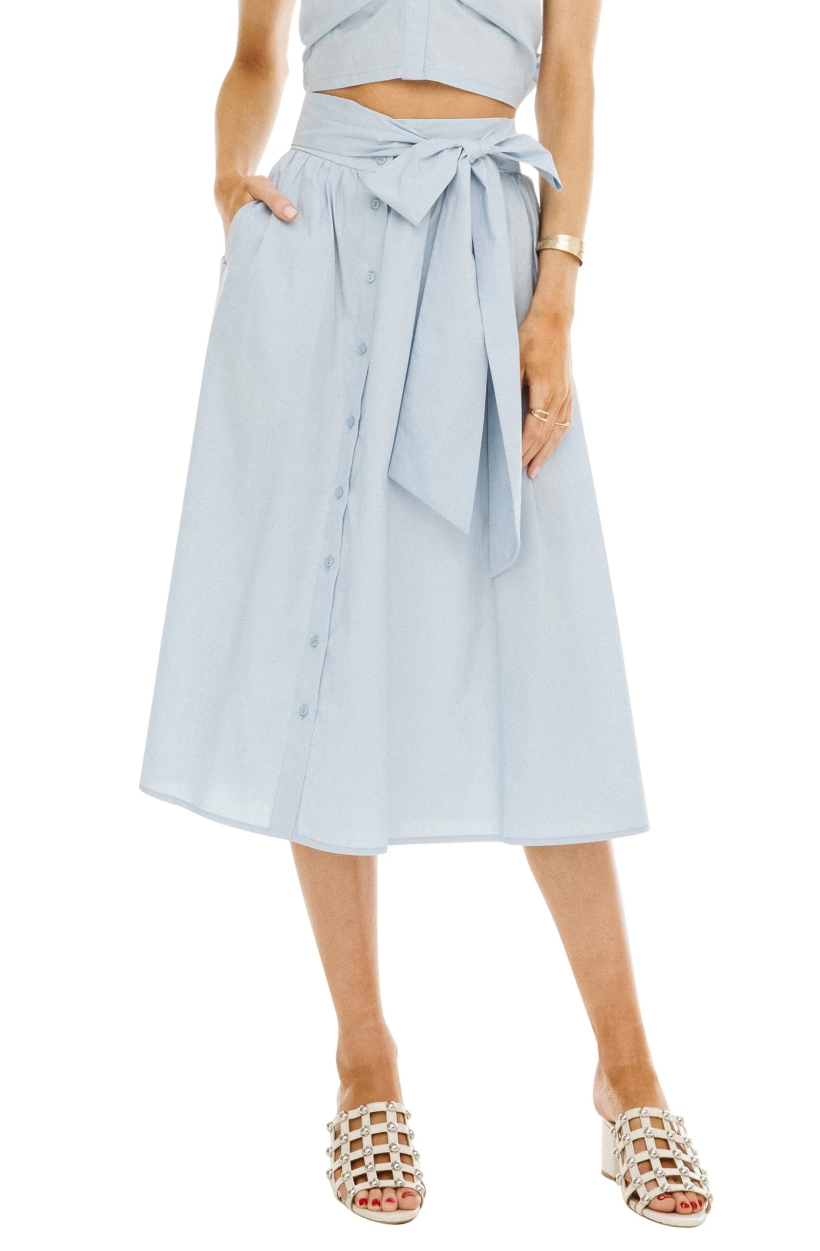 100% Cotton, Length: 27 3/4″ (Size M), Dry Clean Only, Midi Button Up Skirt, Tie Waist, Model is Wearing Size S, Model’s Measurements: Height 5’10” // Bust 31″ // Waist 24″ // Hips 33.5″, Fits True to Size, Style#ACS8079