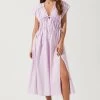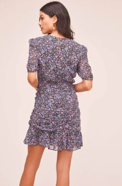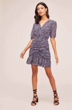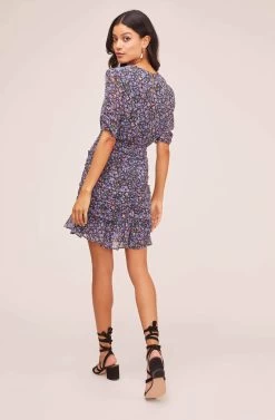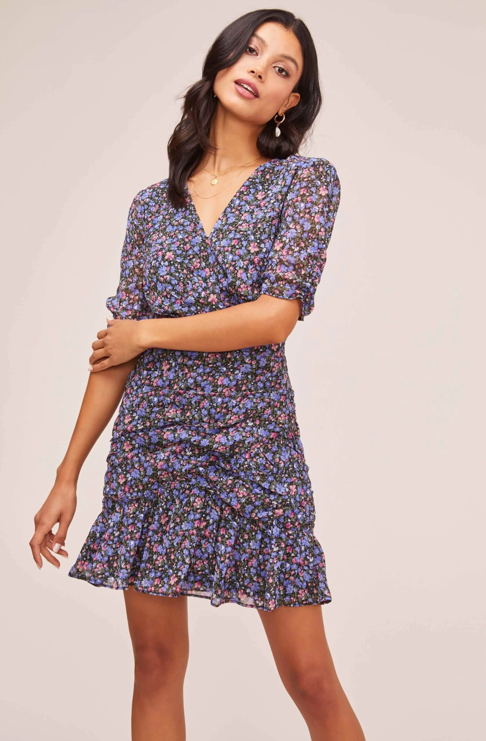 A vintage-inspired mini dress made for close-up moments! V-neckline and wrap front descends to a defined waist. Shirred skirt and ruffle trim evokes soft romance. Ditzy floral print and short sleeves. Keyhole back.