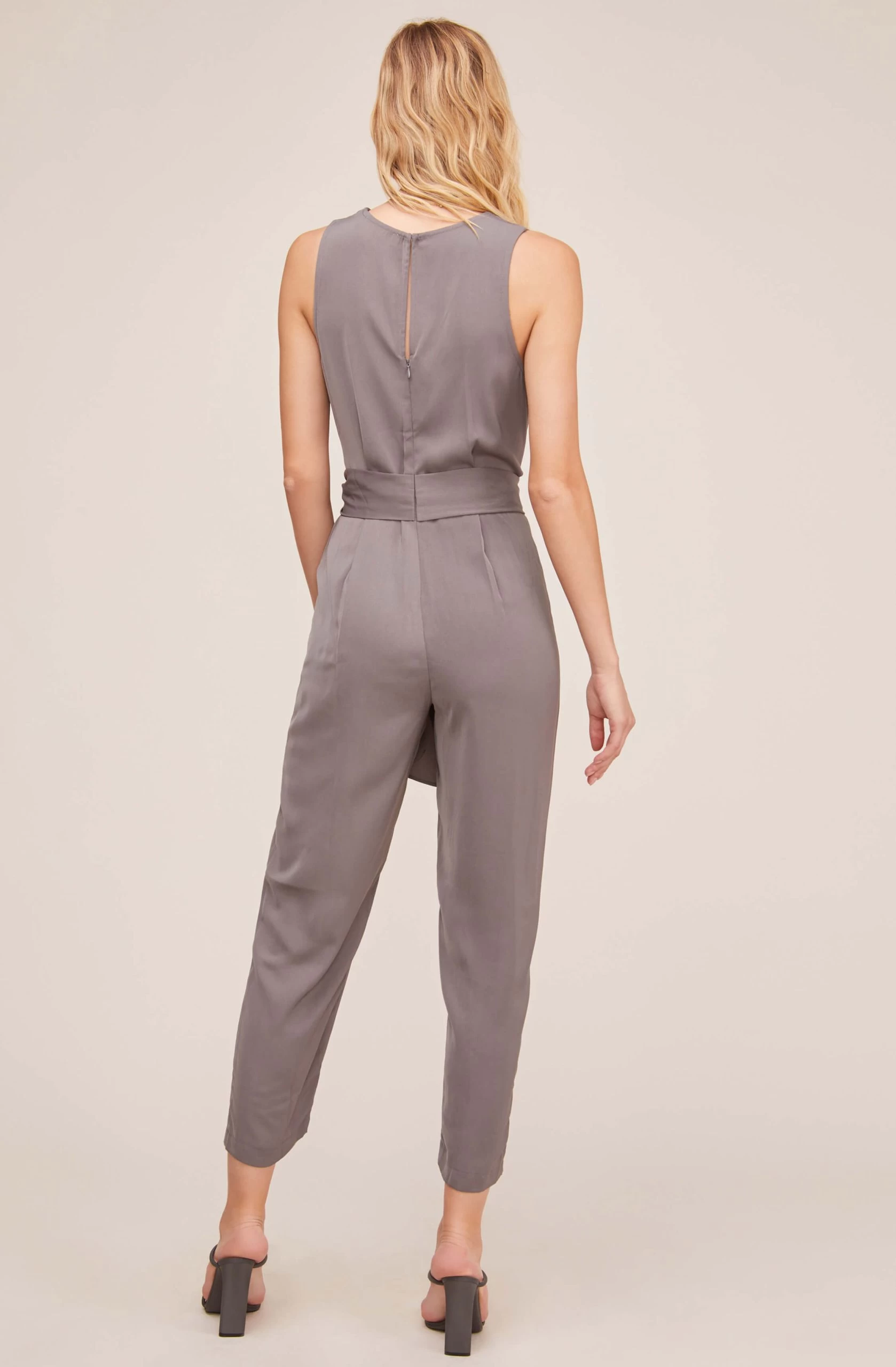 No need to think twice! This jumpsuit is an entire outfit done in one! Featuring a V neckline that descends to a gather bodice and cinched waist with a side tie accent. Pleated bottoms lead to straight leg openings. Sleeveless.