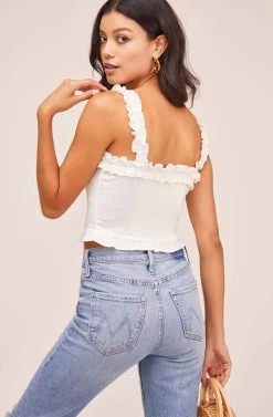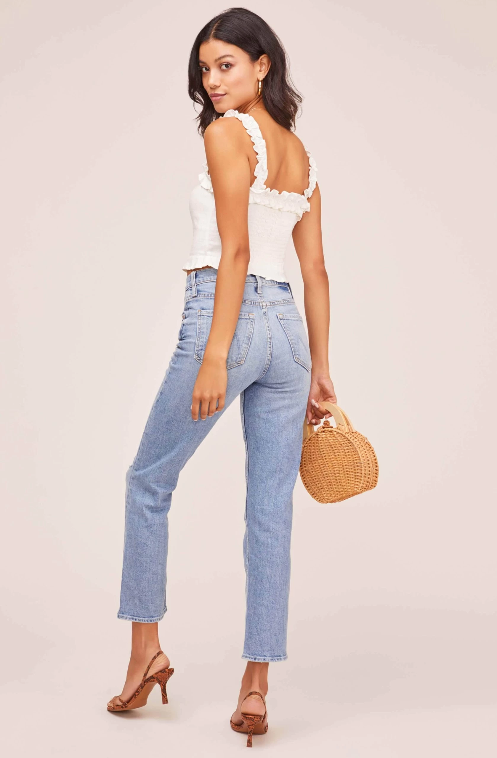 California dreams are within reach! This playful top features a square neckline and a delightful ruffle trim that runs along the shoulder straps. Darted bodice and buttoned front accentuate the silhouette. Subtle ruffle hem. Smocked back.