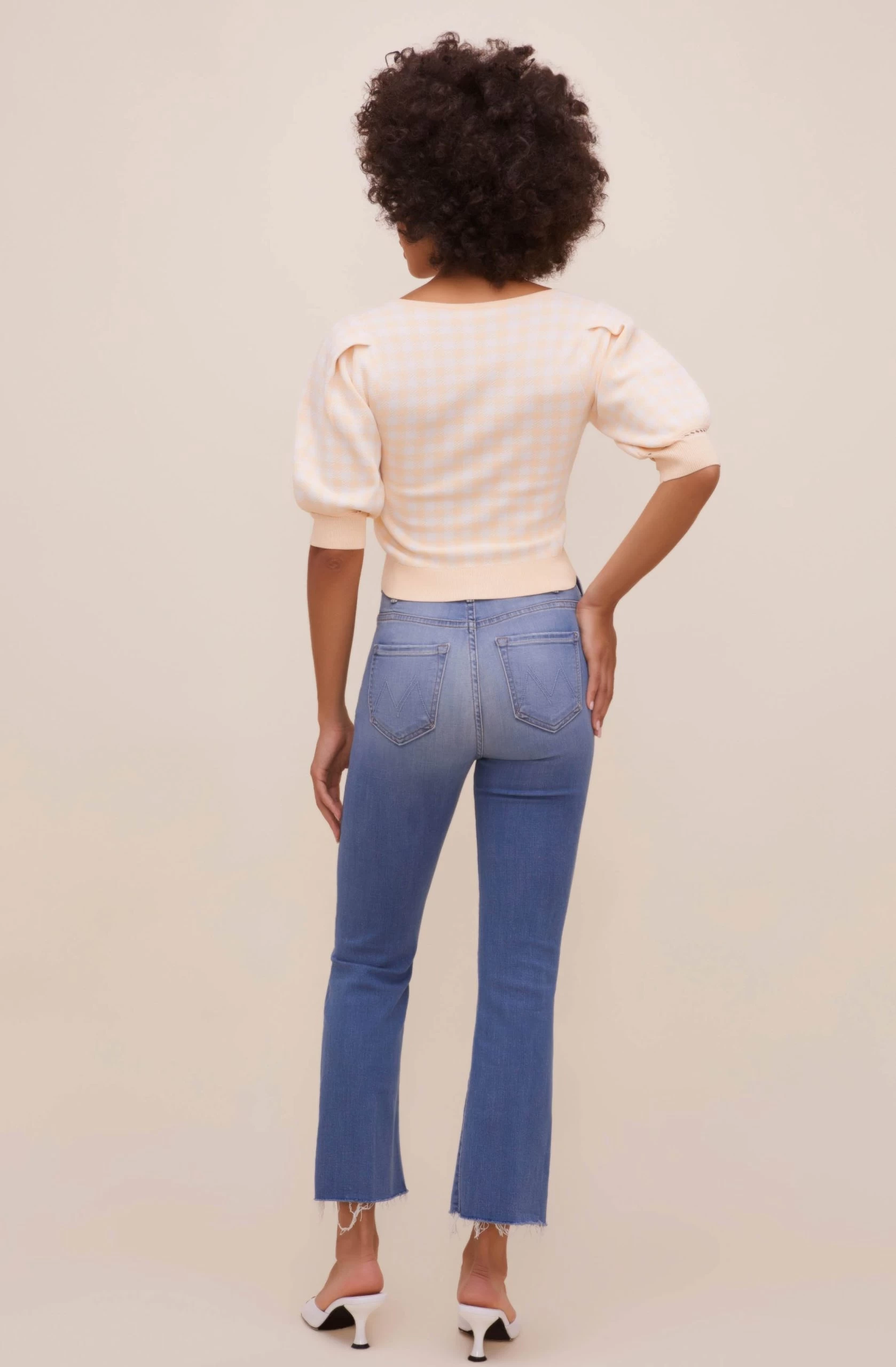 The Skipper Sweater features a soft sweetheart neckline that leads to a ruched front with a tie string accent. Cropped silhouette. Short puff sleeves.