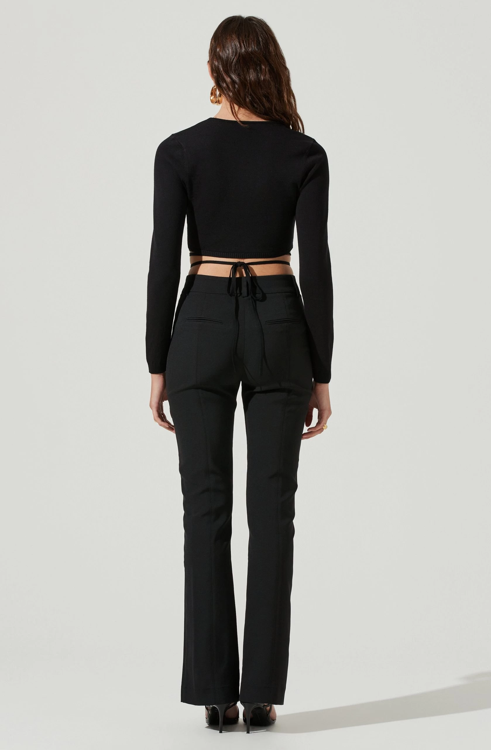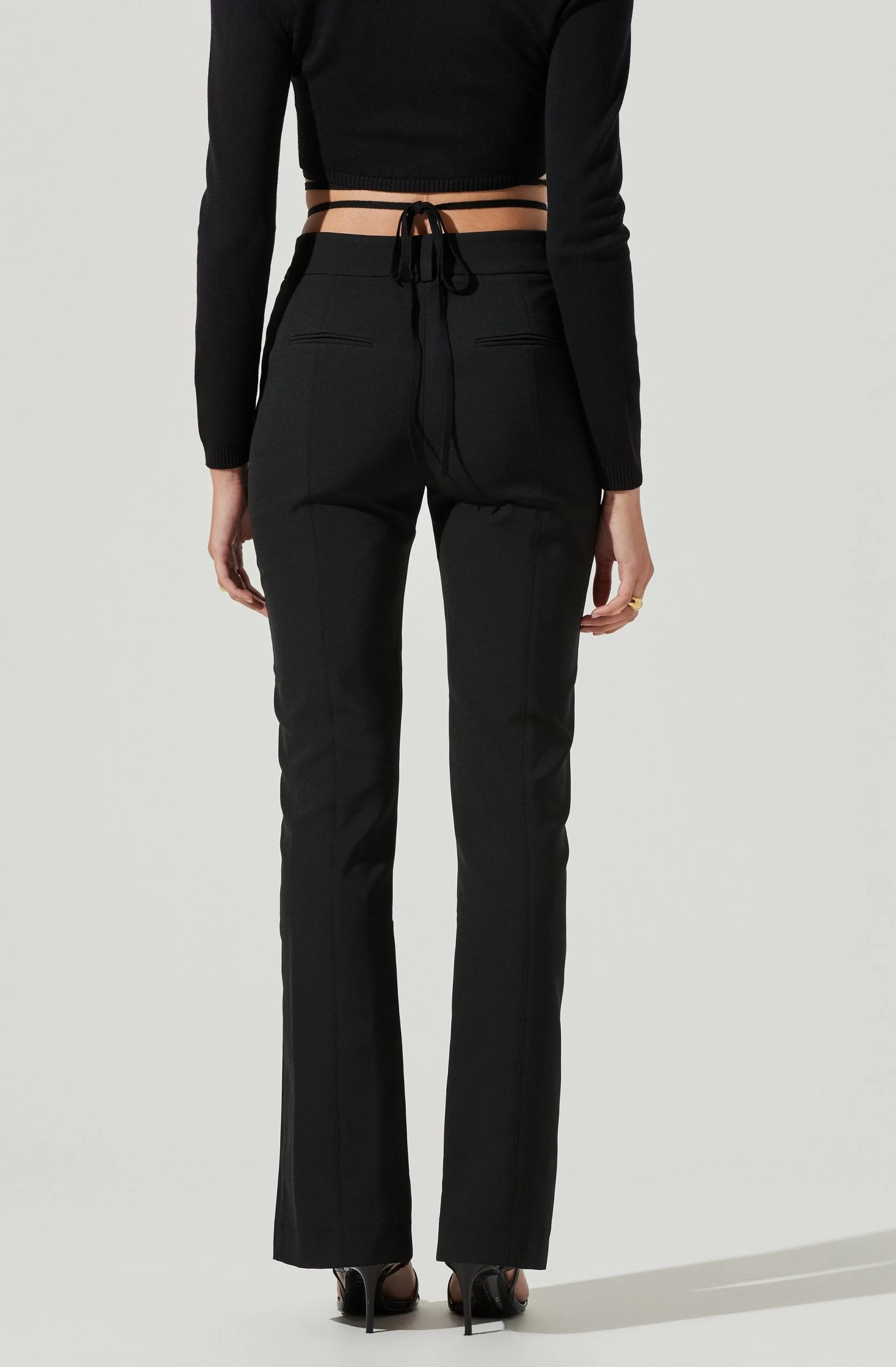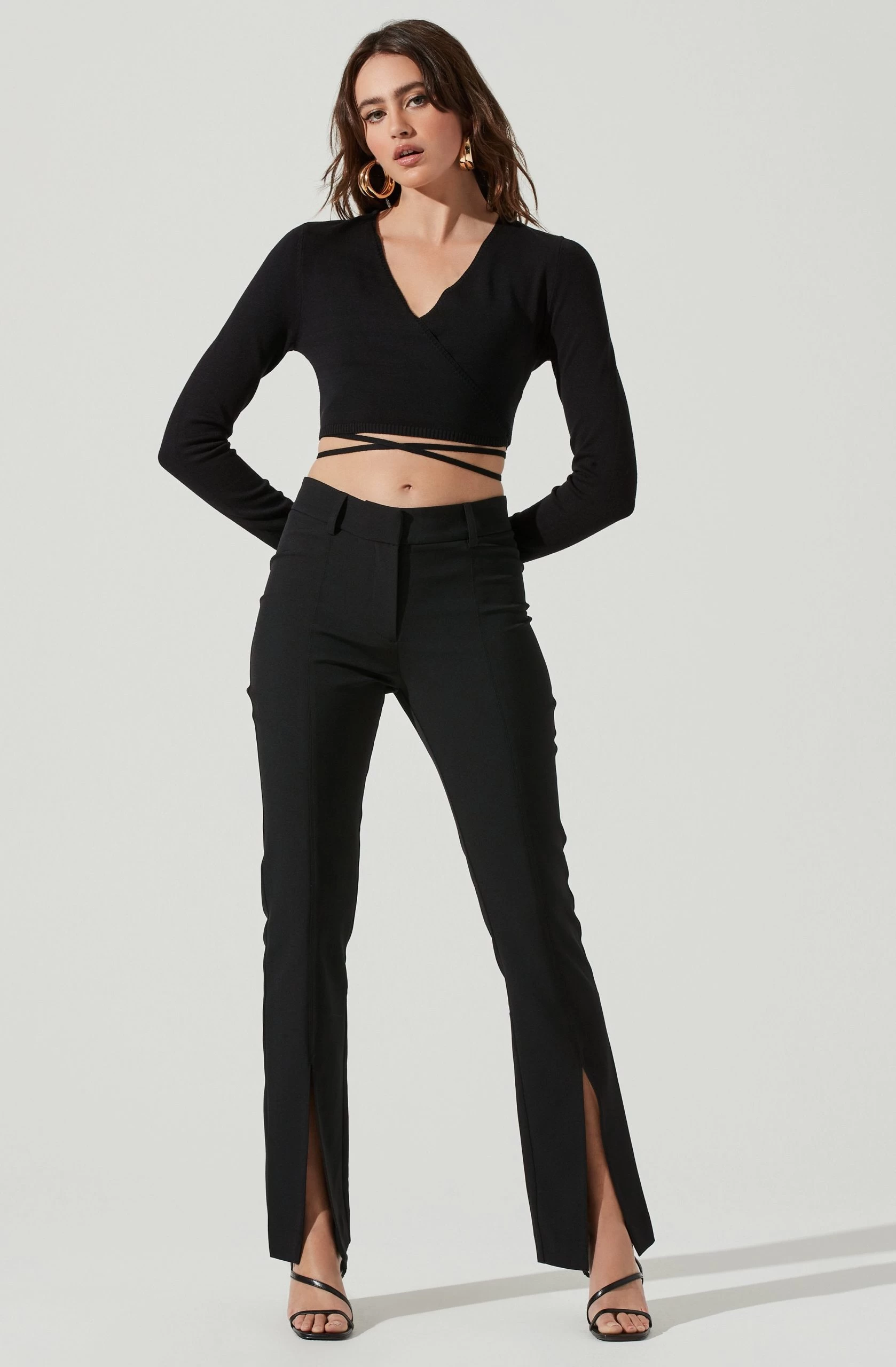 Style up your look with trousers. They feature a high waist with belt loops and vertical seams on the front and back. Relaxed leg openings with a front slit accent.