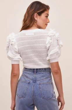 The Sonora Sweater features a pointelle knit design with a round collar. Short puff sleeves feature ruffle trim throughout.