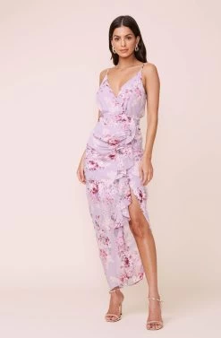 Sultry summer nights call for this sexy maxi dress! It features a plunge neckline that leads to a surplice front. Tie waist leads to a ruffled maxi skirt with a sexy side slit accent. Statement floral print.