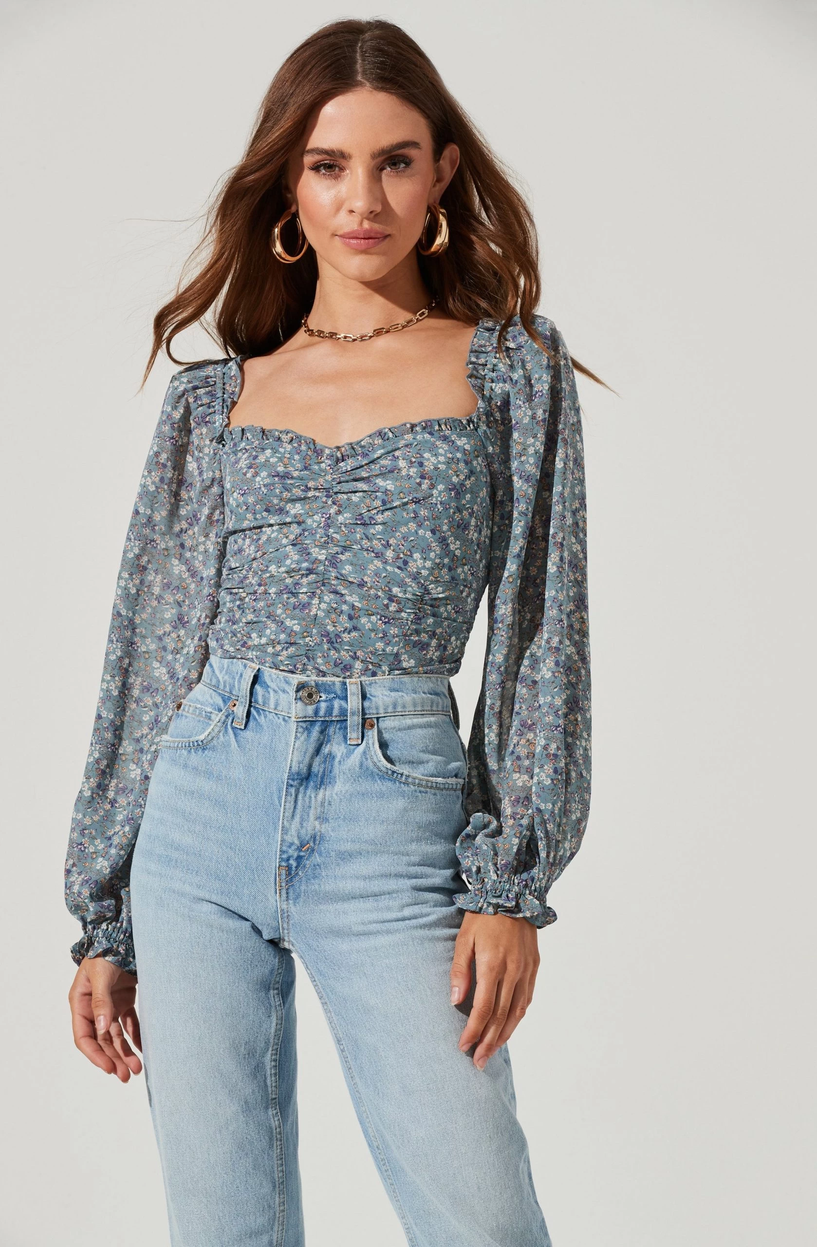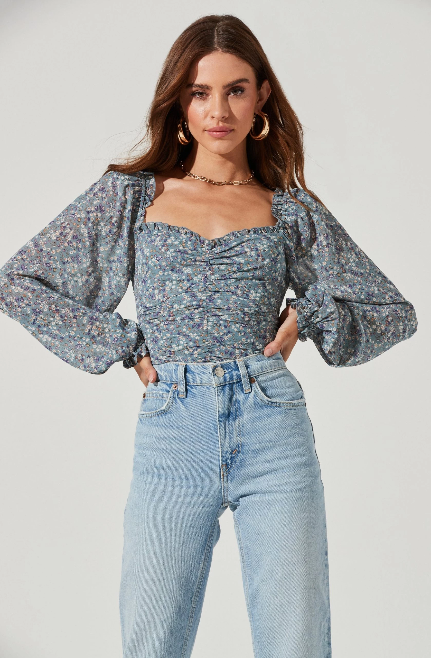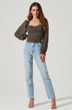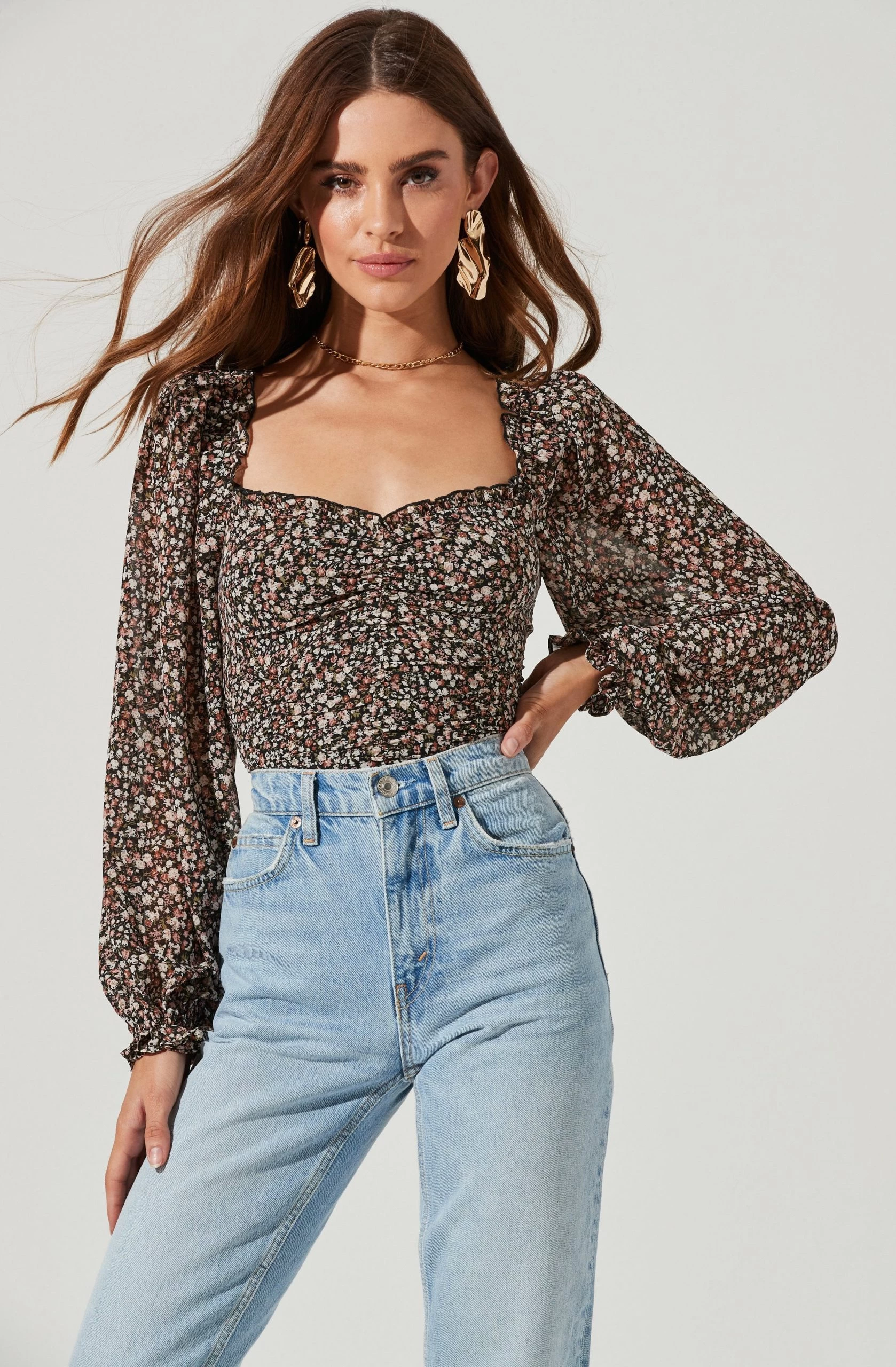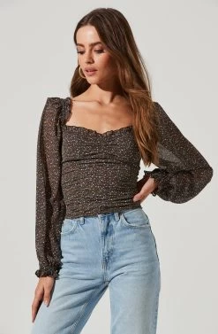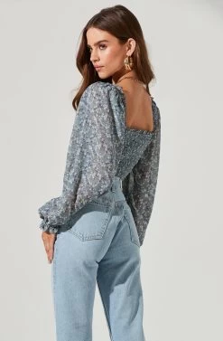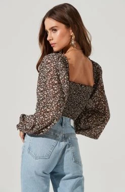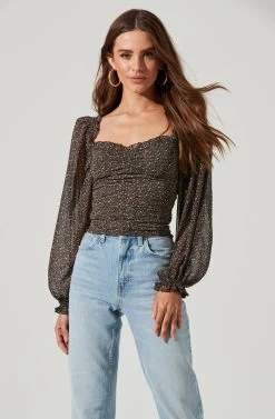 Style is in bloom this season. This top features a flattering sweetheart neckline that leads to a ruched bodice. Long balloon sleeves. Smocked back.