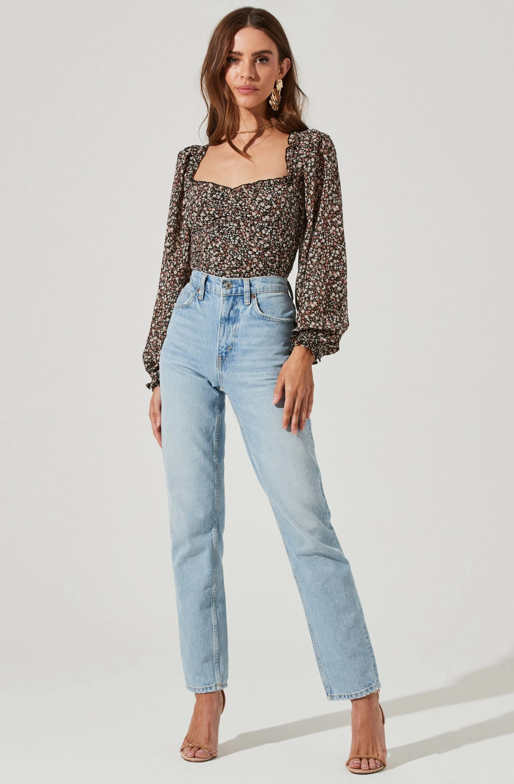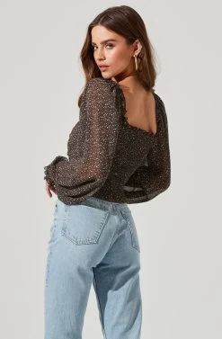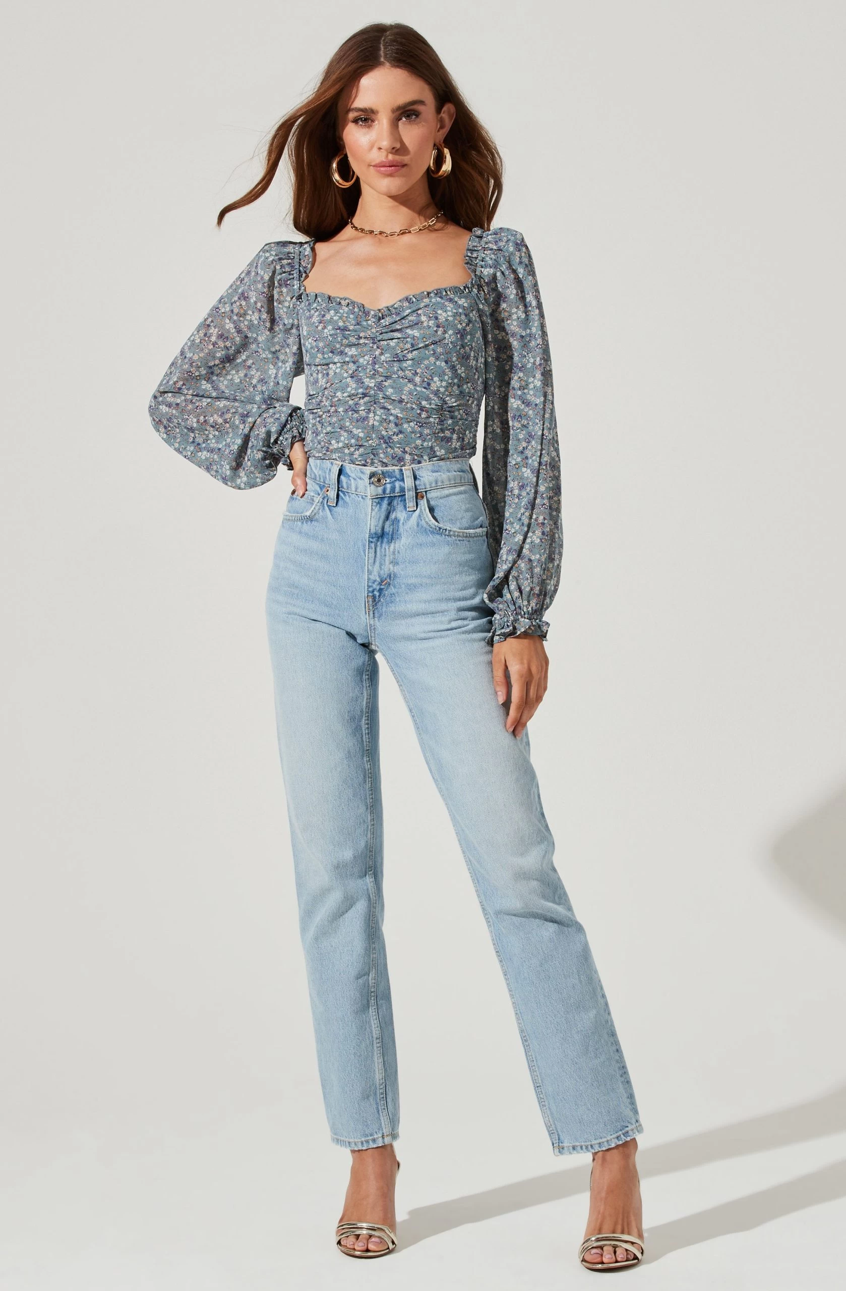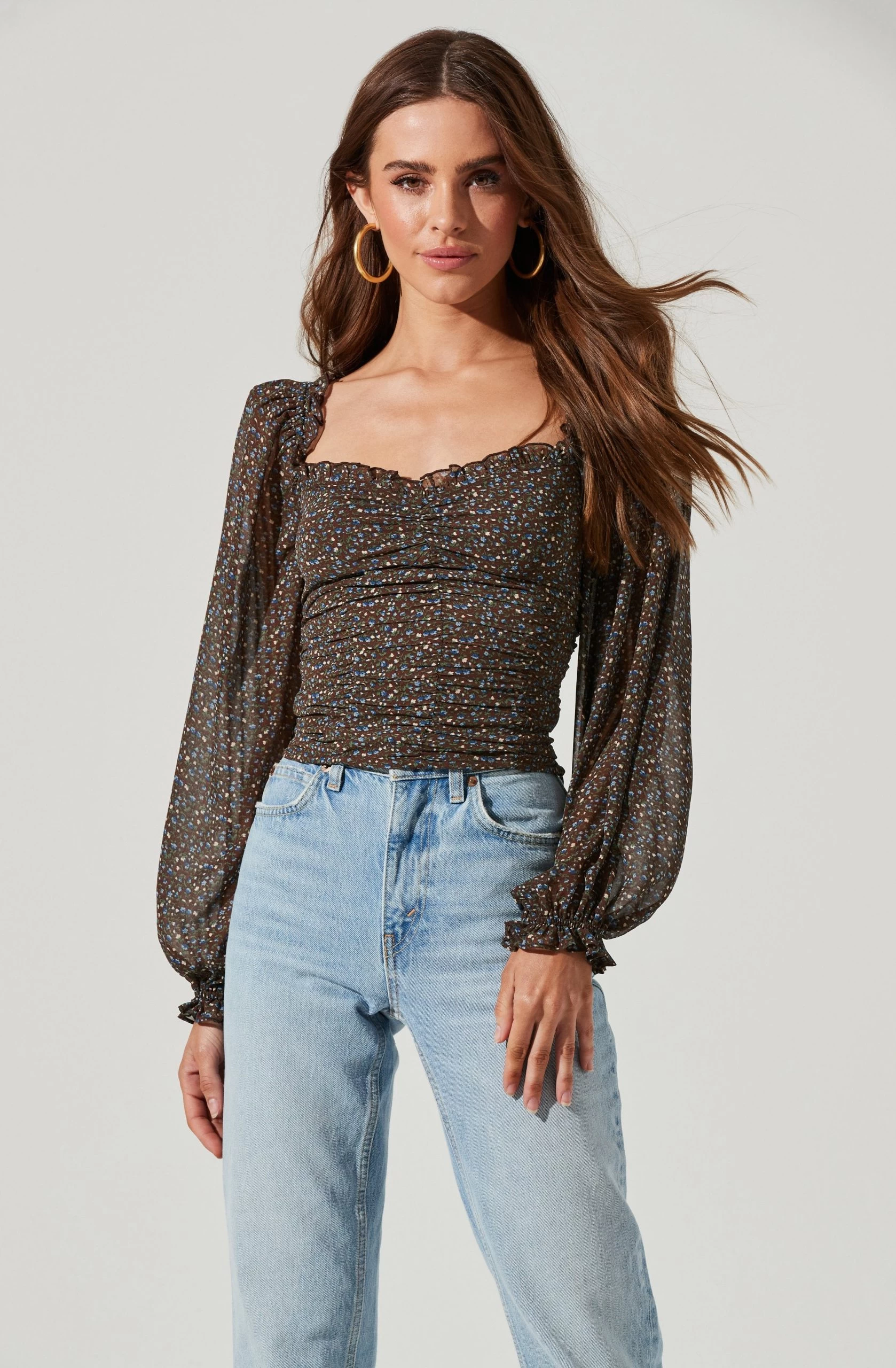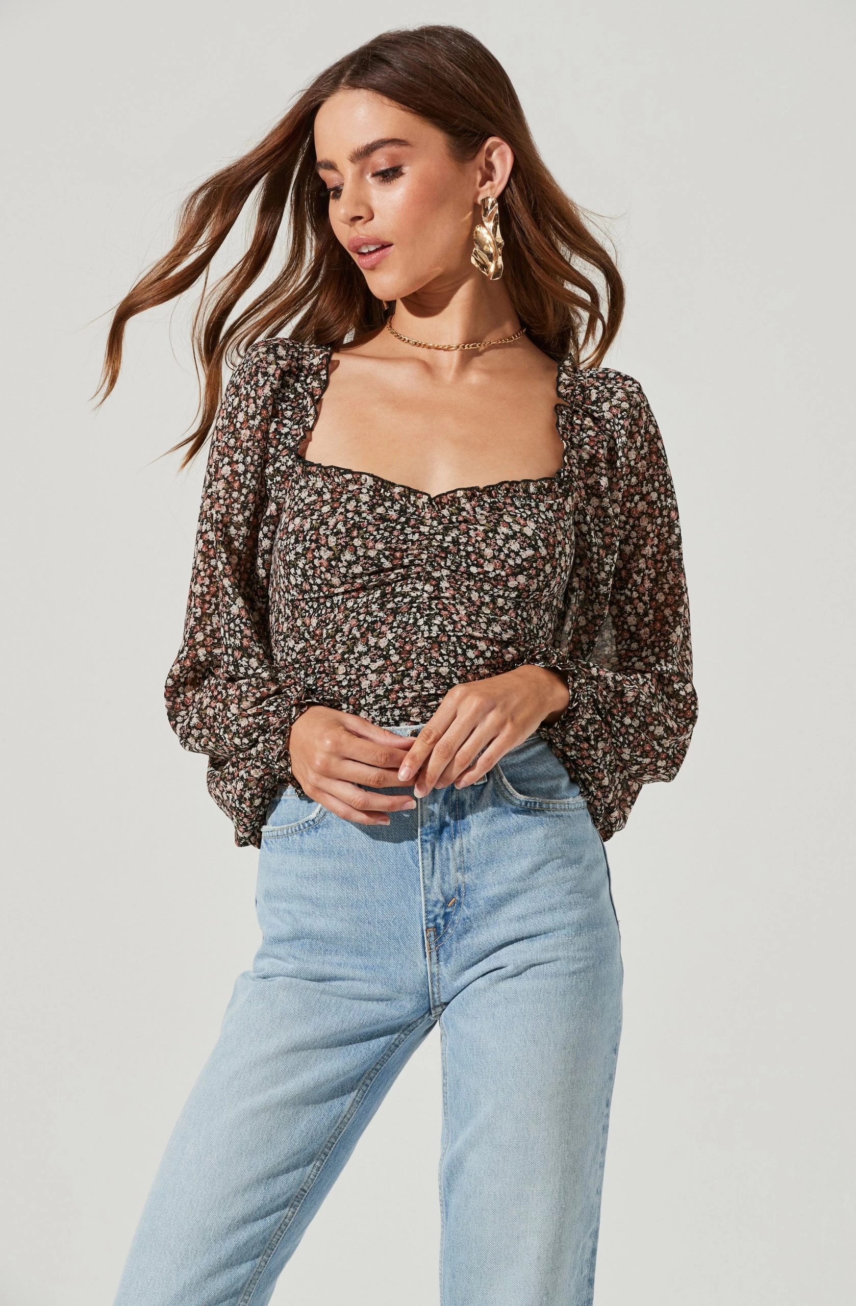 Style is in bloom this season. This top features a flattering sweetheart neckline that leads to a ruched bodice. Long balloon sleeves. Smocked back.