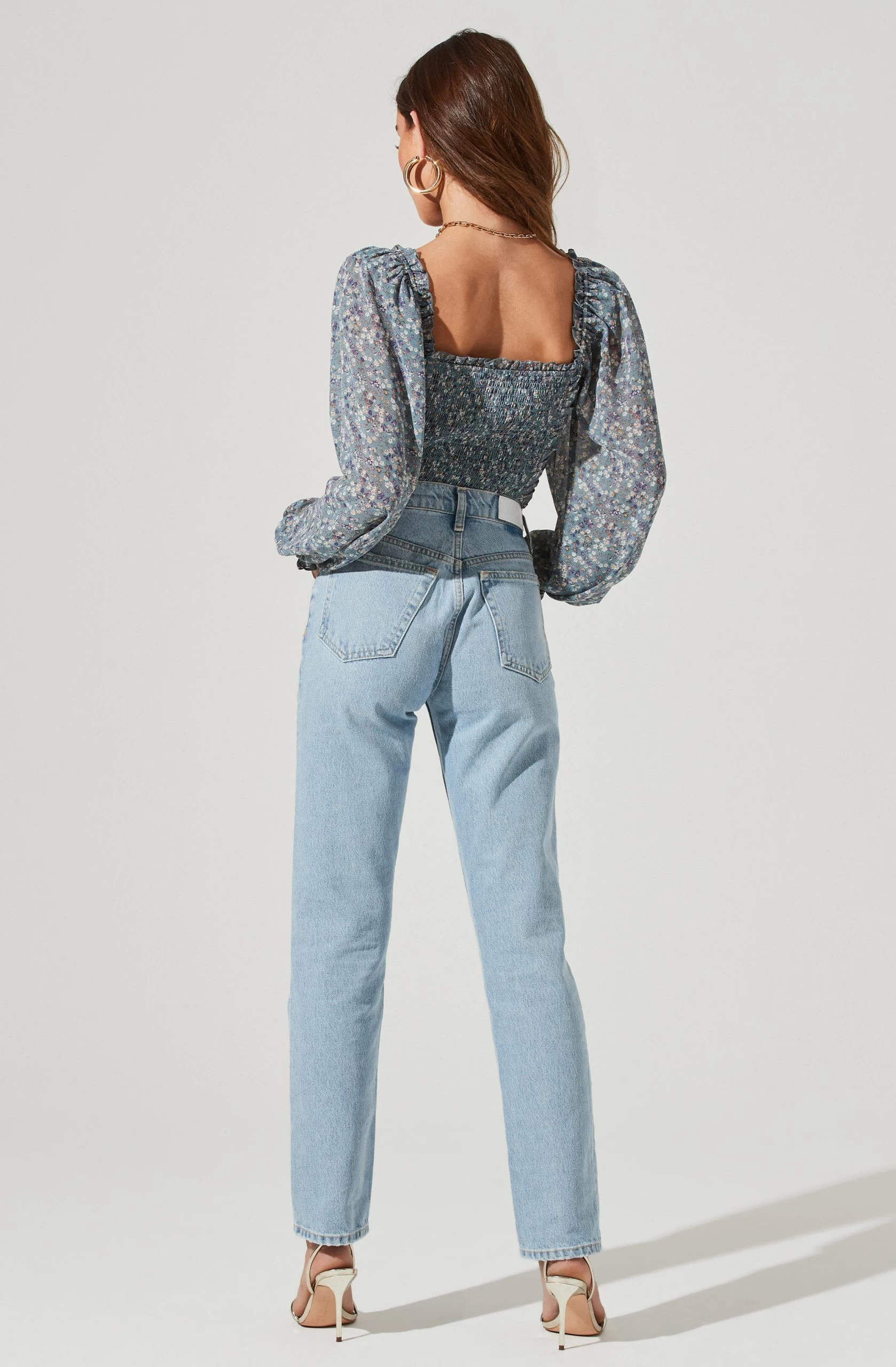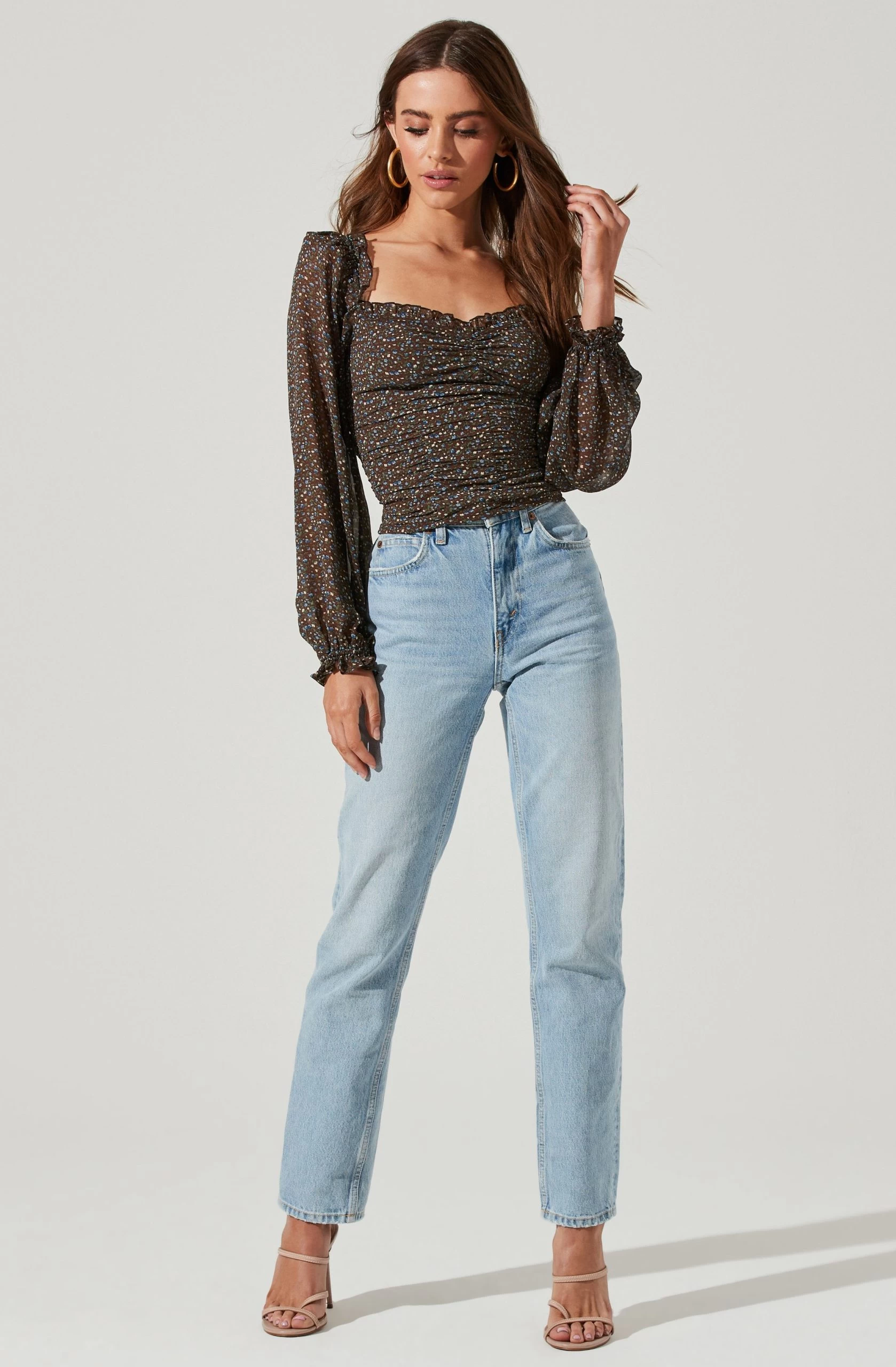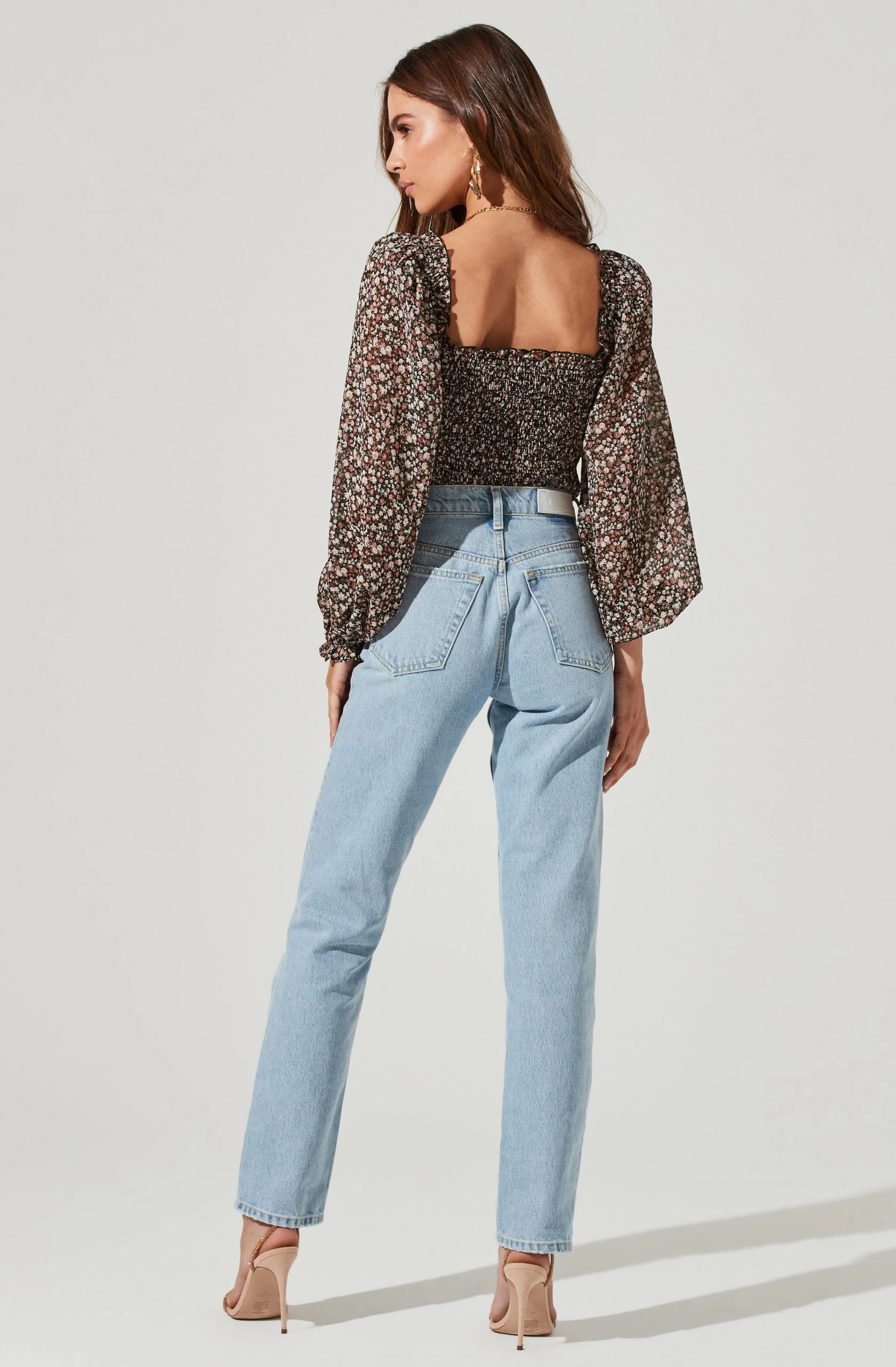 Style is in bloom this season. This top features a flattering sweetheart neckline that leads to a ruched bodice. Long balloon sleeves. Smocked back.