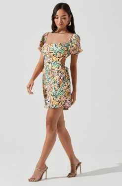 The Talula Dress features a tropical papaya print and starts with a square neckline that descends to a fitted bodice with cinched side cutout accents. Short puff sleeves.