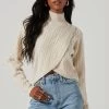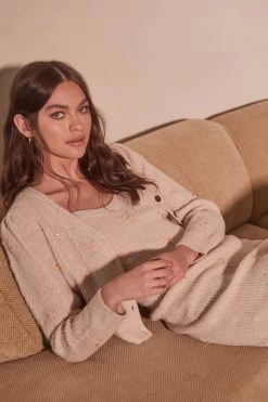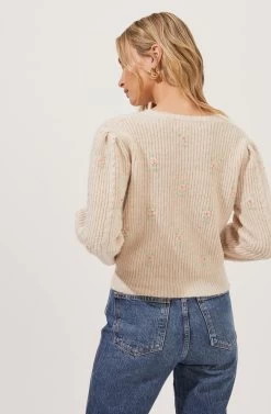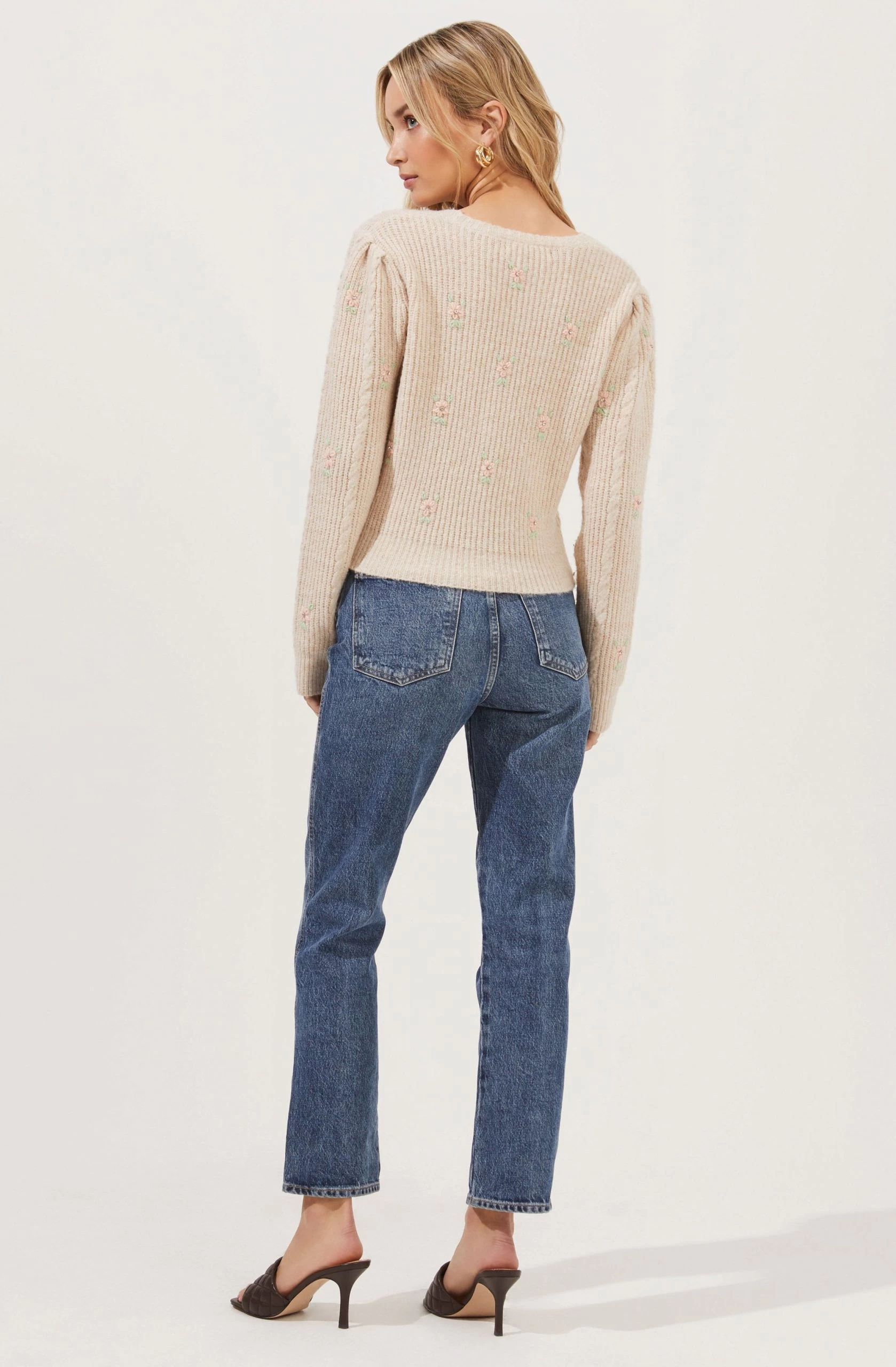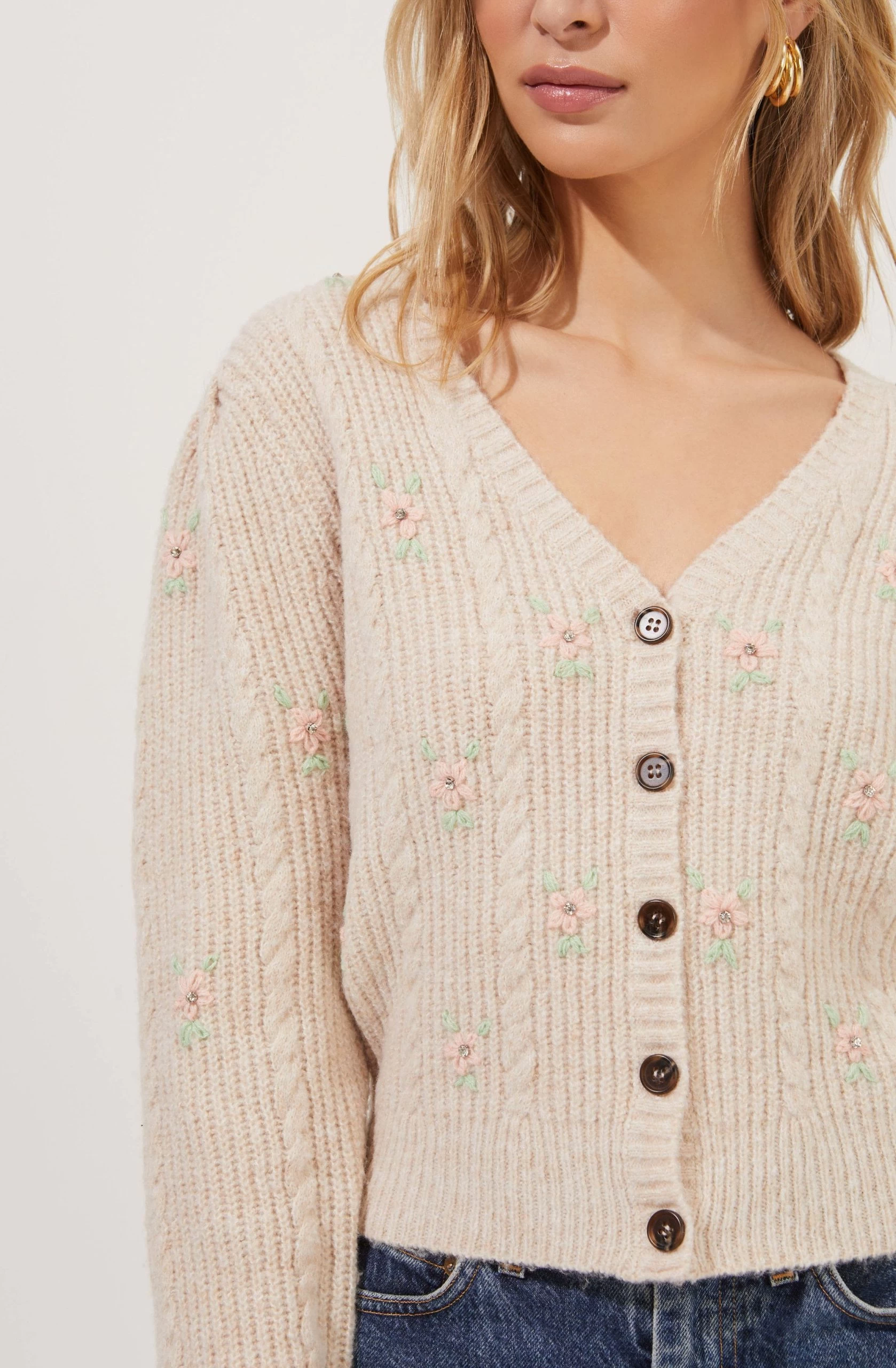 This sweet cardigan features a V neckline that leads to a contrast button front. Cable knit design throughout with embroidered flower details throughout. Rhinestone accents. Long sleeves.