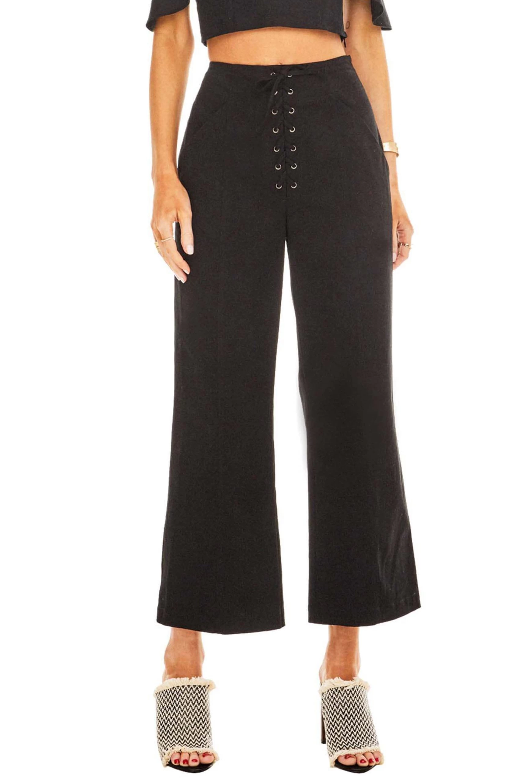 97% Cotton / 3% Elastane, Inseam Length: 26 1/2″ / Leg Opening: 11″ / Front Rise: 12″ (Size M), Zipper Closure, Dry Clean Only, Wide Leg Trousers, Grommet Laced, Model is Wearing Size S, Model’s Measurements: Height 5’10” // Bust 31″ // Waist 24″ // Hips 33.5″, Fits True to Size, Style#ACP6448