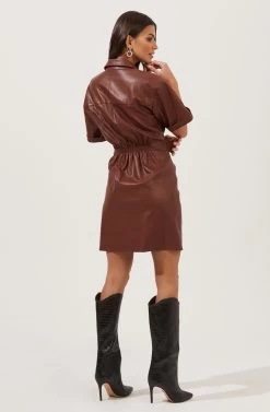 The Terra Dress features a faux leather construction. Pointed collar leads to a V neck collar and wrapped design. Asymmetrical buttons along the front and gathered details throughout. Short sleeves. Smocked back.