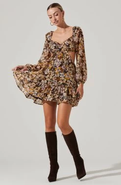 The Teyla Dress features a moody floral print throughout. Sweetheart neckline leads to a ruched bust and side cutout accents. Empire waist leads to an abbreviated hem. Long sleeves. Strappy back with tying accents. Lined.