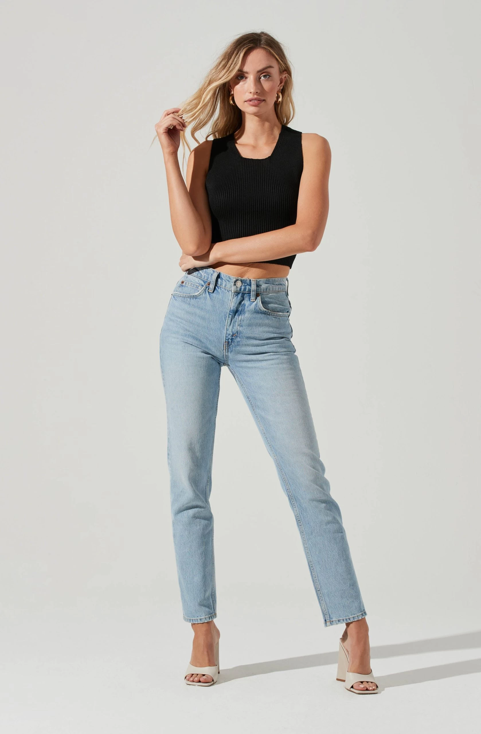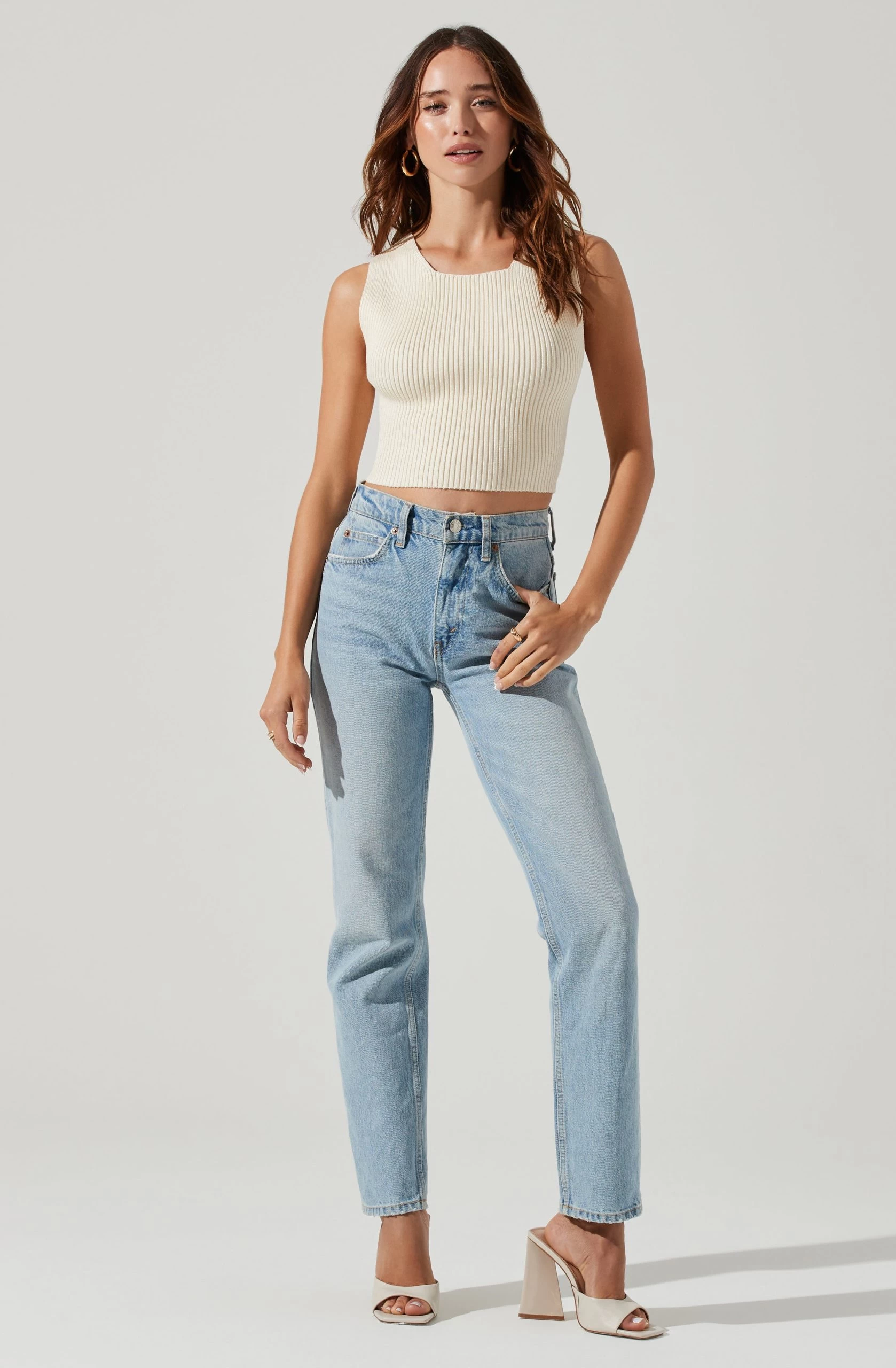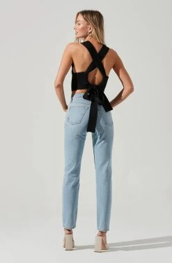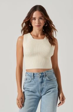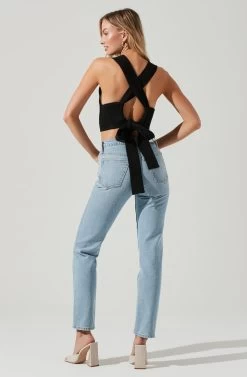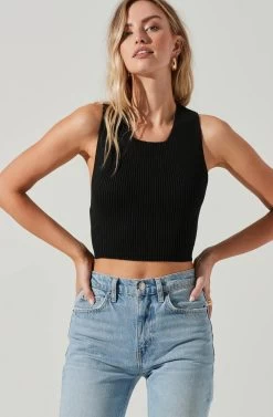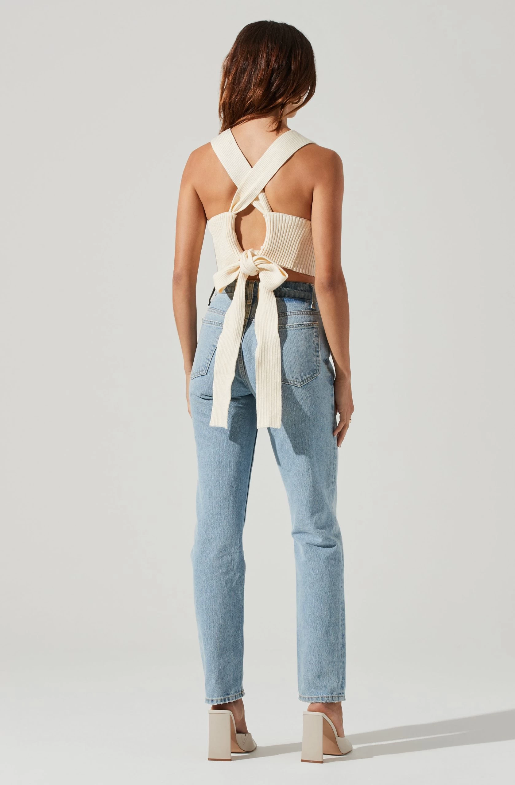 This knit sweater tank features a square neckline, cross strap design and tie back detail. Cutout back. Cropped.