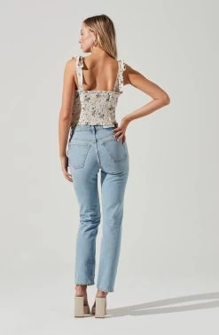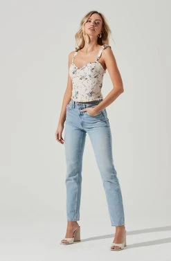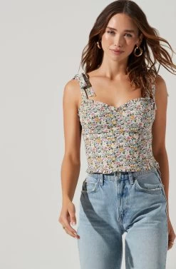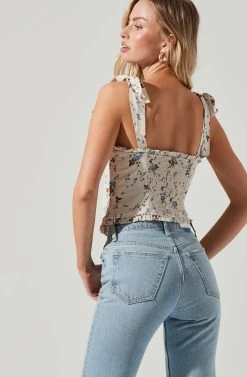 This romantic cami features a sweetheart neckline with a delicate ruffle trim. Statement tie straps add a romantic detail. Smocked back.