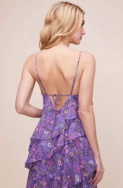 From weddings to date nights, this maxi dress can up the romance! It features a V neckline that descends to a tiered bodice with a flattering ruffle design. Delicate floral print throughout and front slit accent adds a touch of sexy. Low-cut back and barely-there straps.